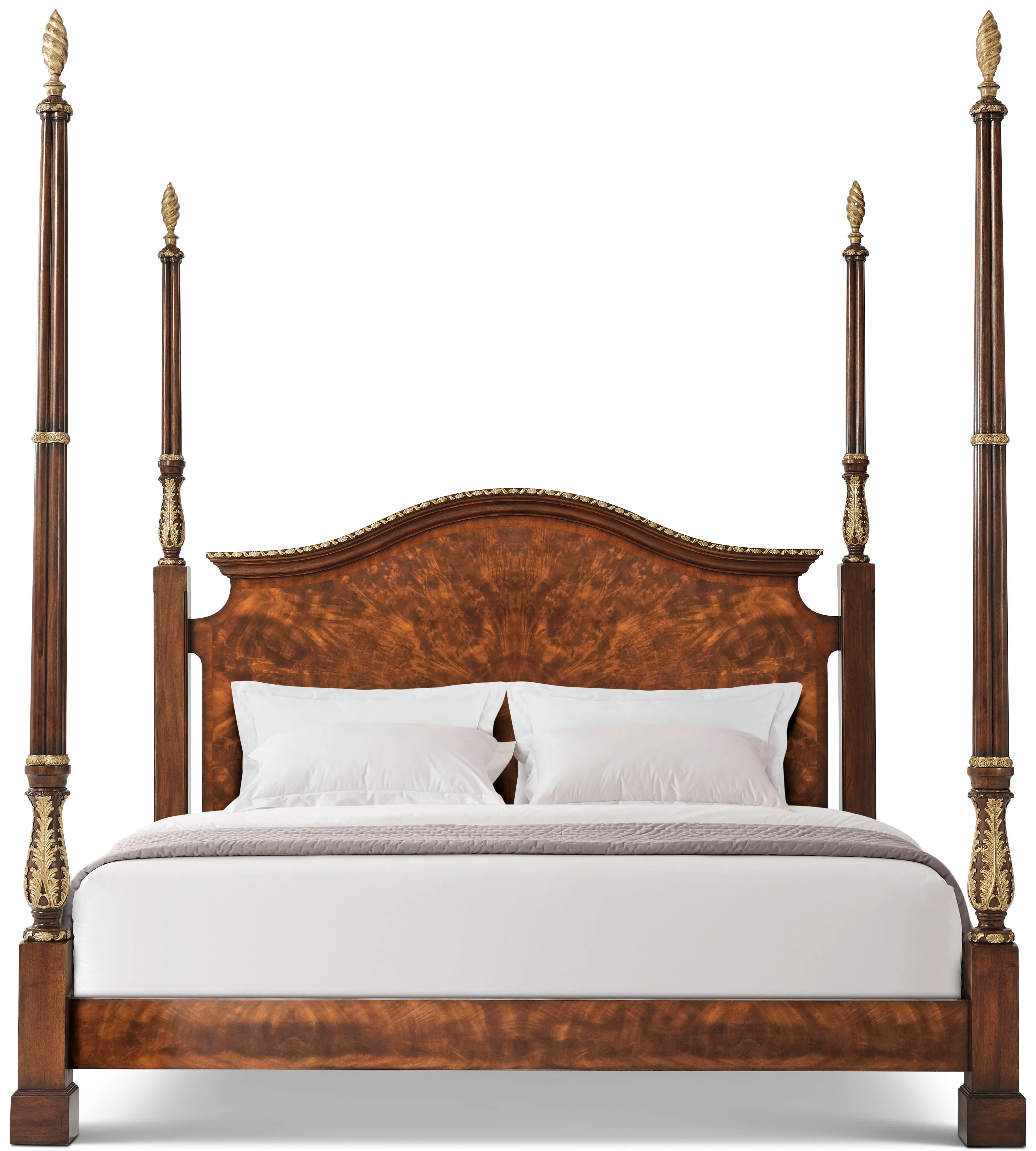 A carved mahogany, flame veneered and parcel gilt four poster King Bed, the arched headboard with a carved cornice and finely carved acanthus leaf carved baluster and cluster columns with spiral carved pine cone finials. The original George III, circa 1760 in the India Silk Room.