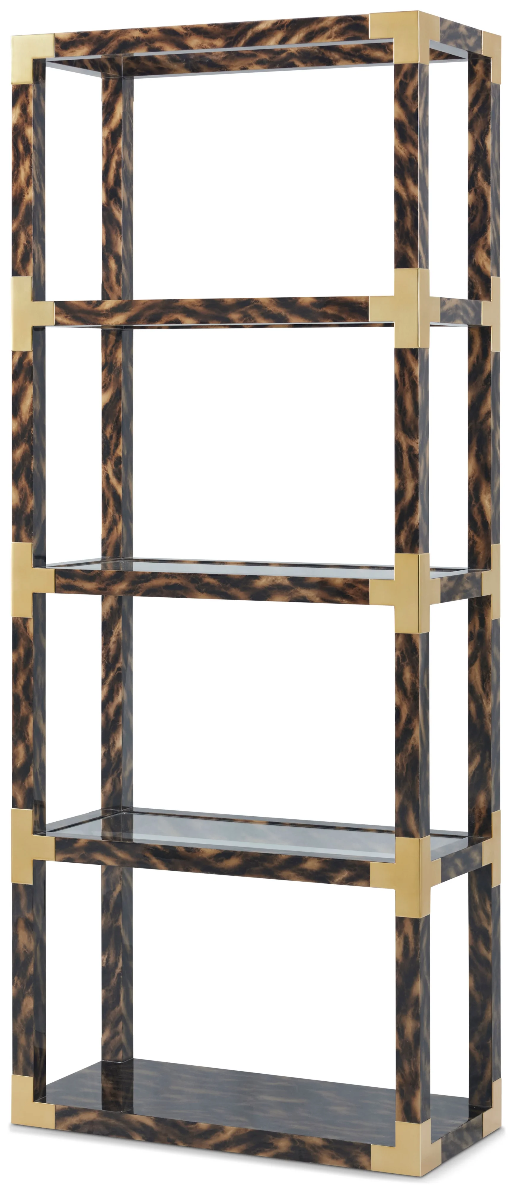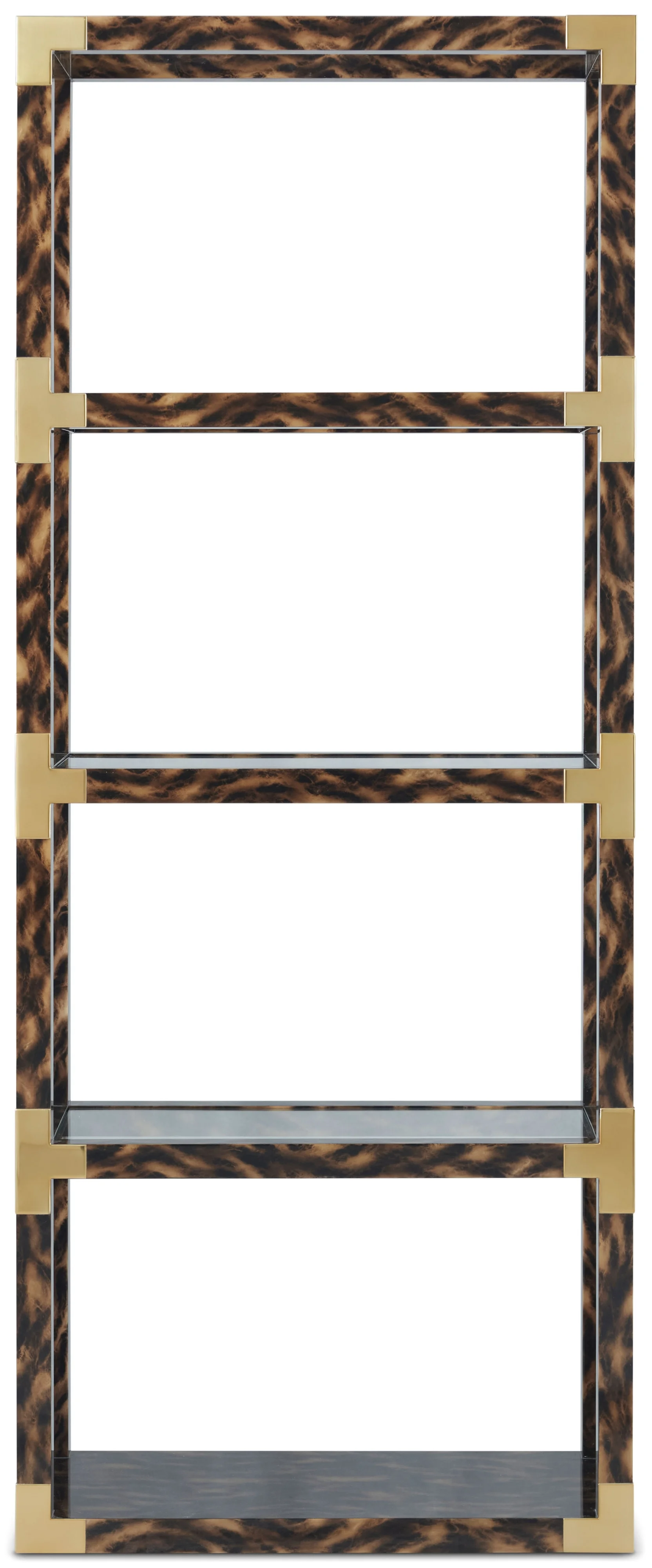 The Arakan Etagere embodies timeless sophistication and casual charm. The mottled amber tones of the hand-painted tortoise faux horn envelop the frame and its four open shelves, adding natural beauty to the easily accessible display space. Brass finished stainless steel caps complement each shelf and corner of the unit, further extending the piece's organic warmth.