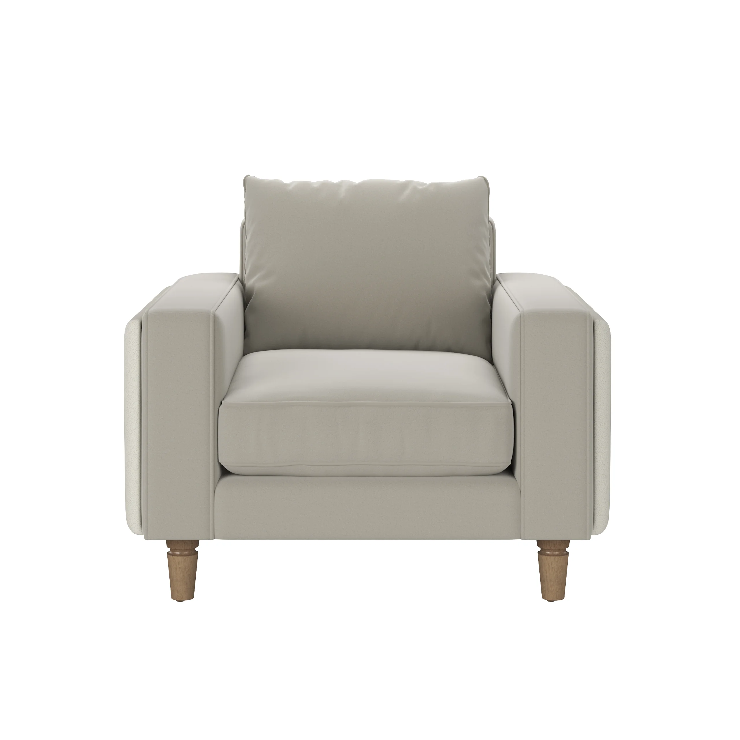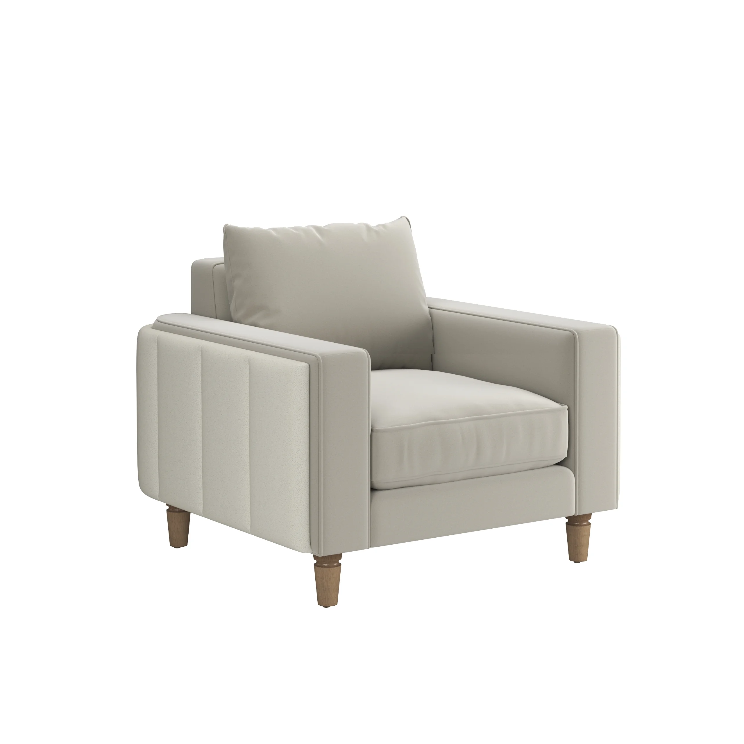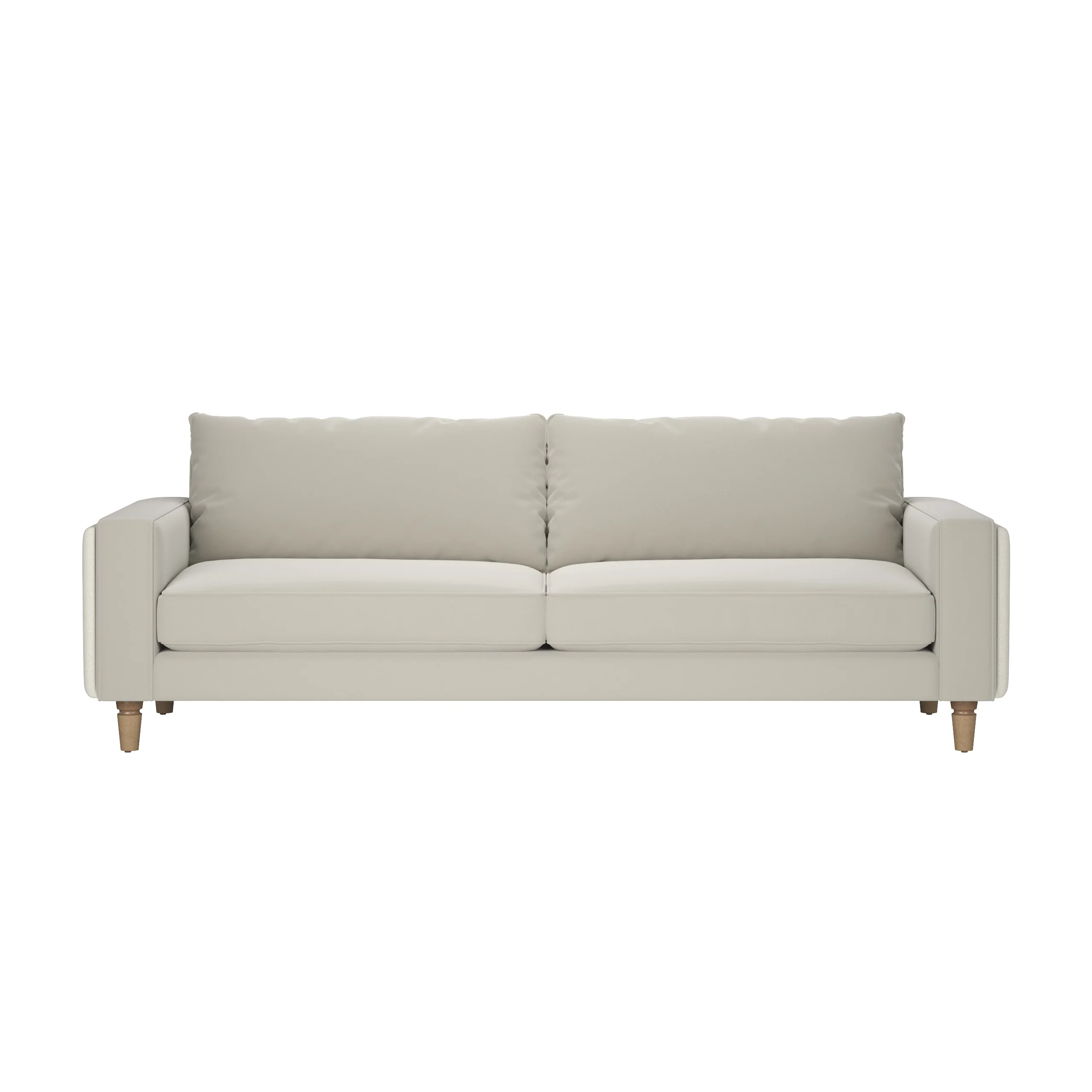 The set is upholstered in a soft, velvet-like polyester fabric in a soothing sand color, which adds warmth and texture to the overall design. The fabric is easy to clean and maintain, with a water-based or solvent cleaning code. The exposed wood legs add a touch of natural beauty to the set, while the track arms provide a comfortable and supportive place to rest your arms.