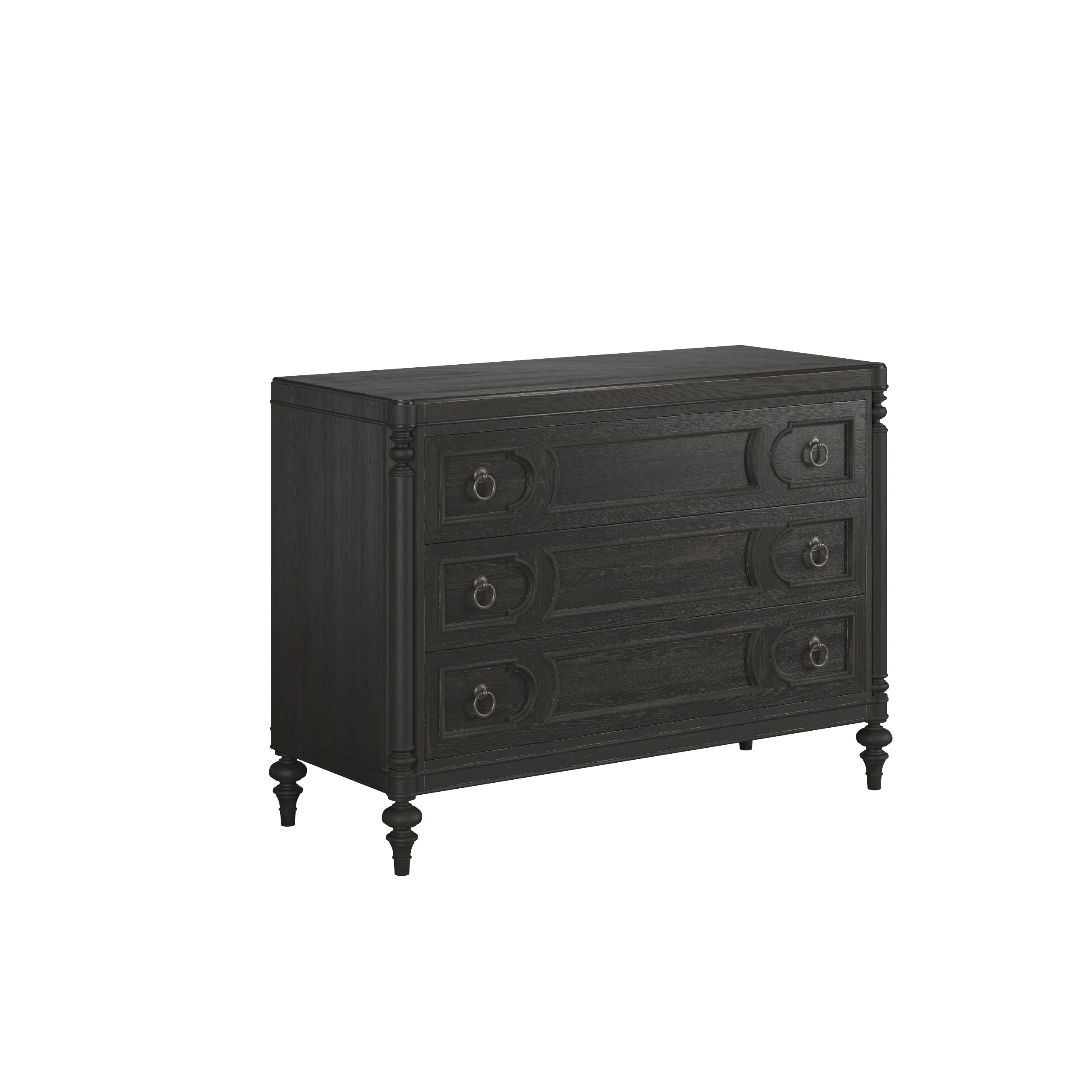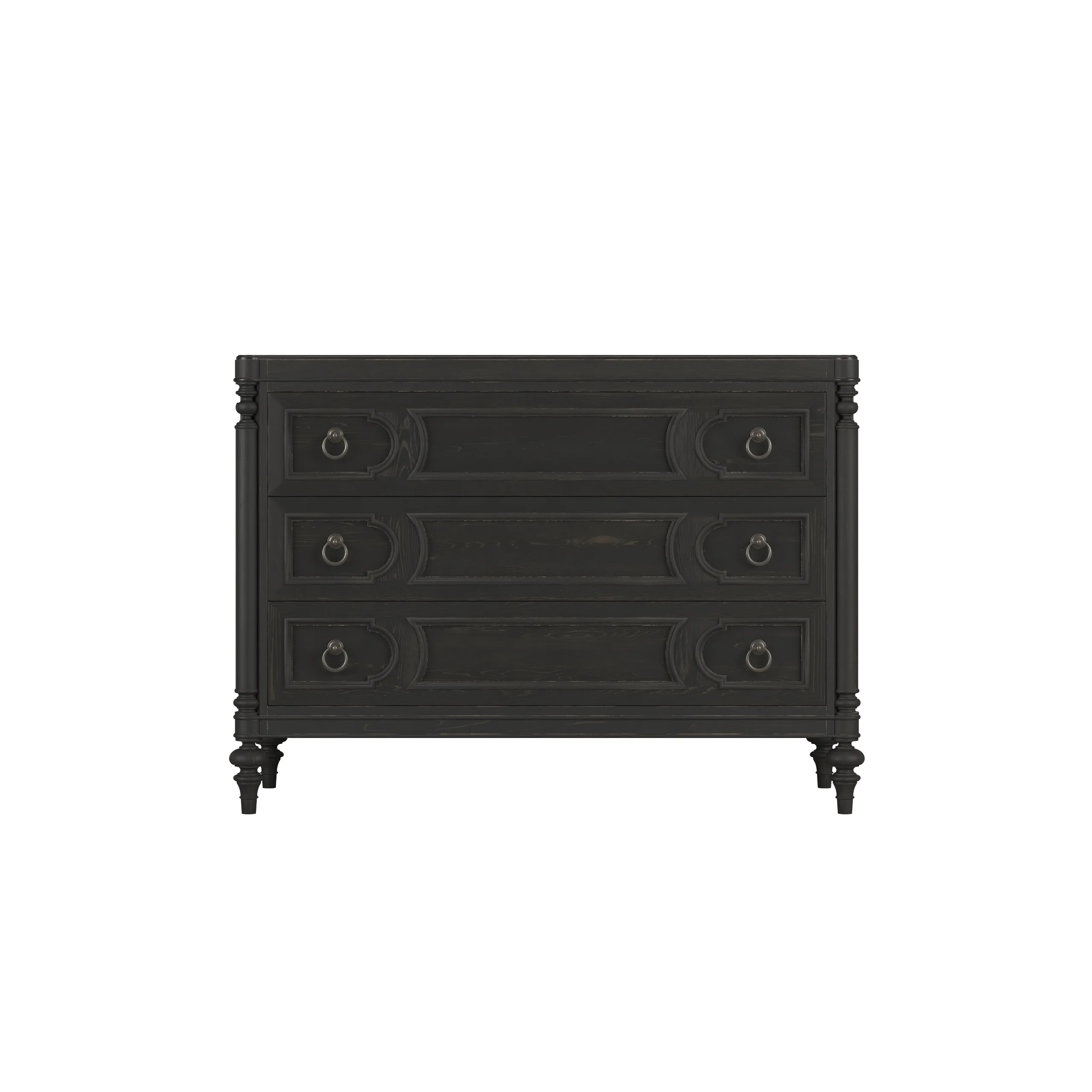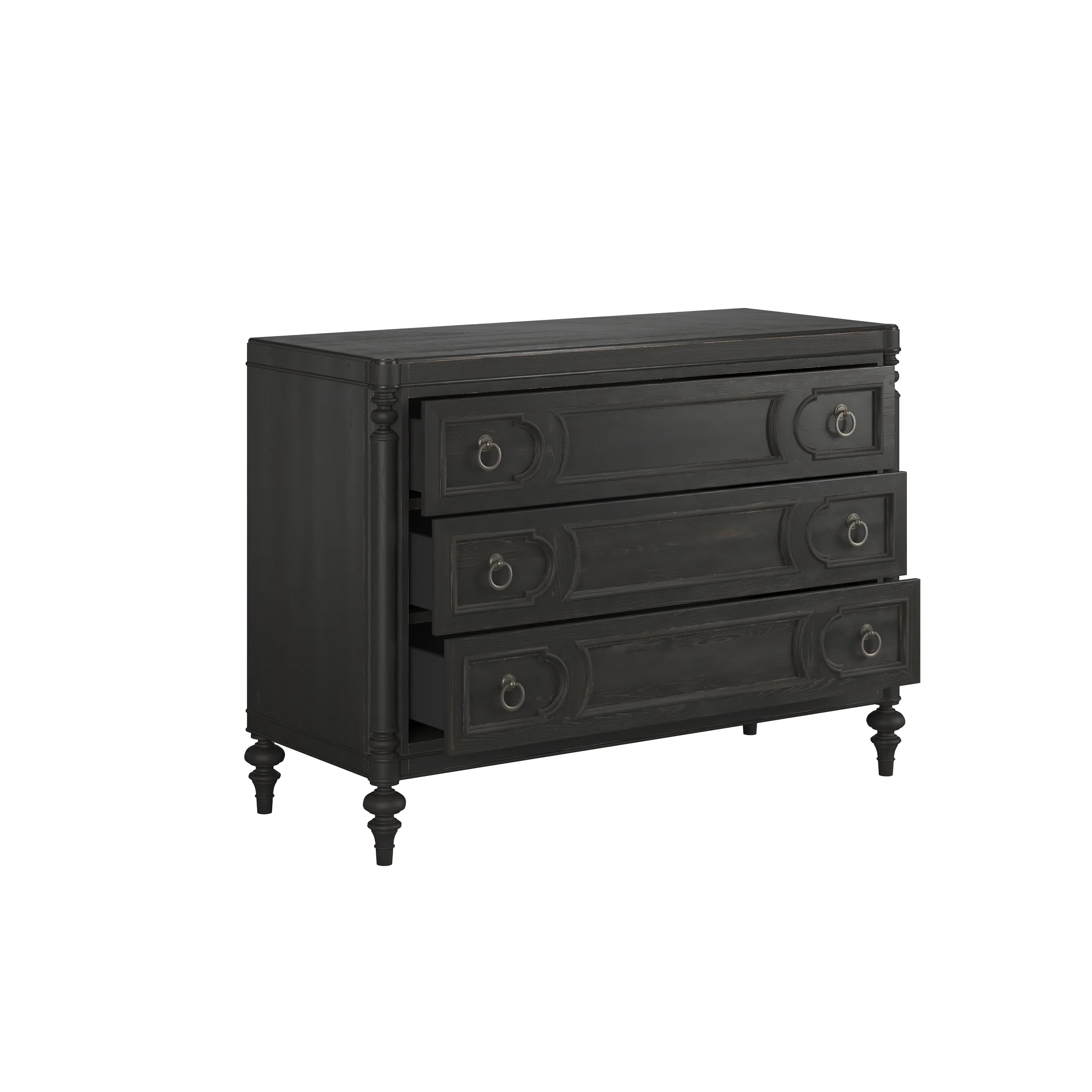 Beautifully constructed with blackened sable hand glazed finish, the three drawer Atrium Bachelor's Chest offers more than just ample storage space, it's an eye-catching combination contemporized classic style and historical elegance. Featuring traditional raised paneling with beautiful curved accent molding detail, each drawer is finished with oil rubbed bronze ring pulls.