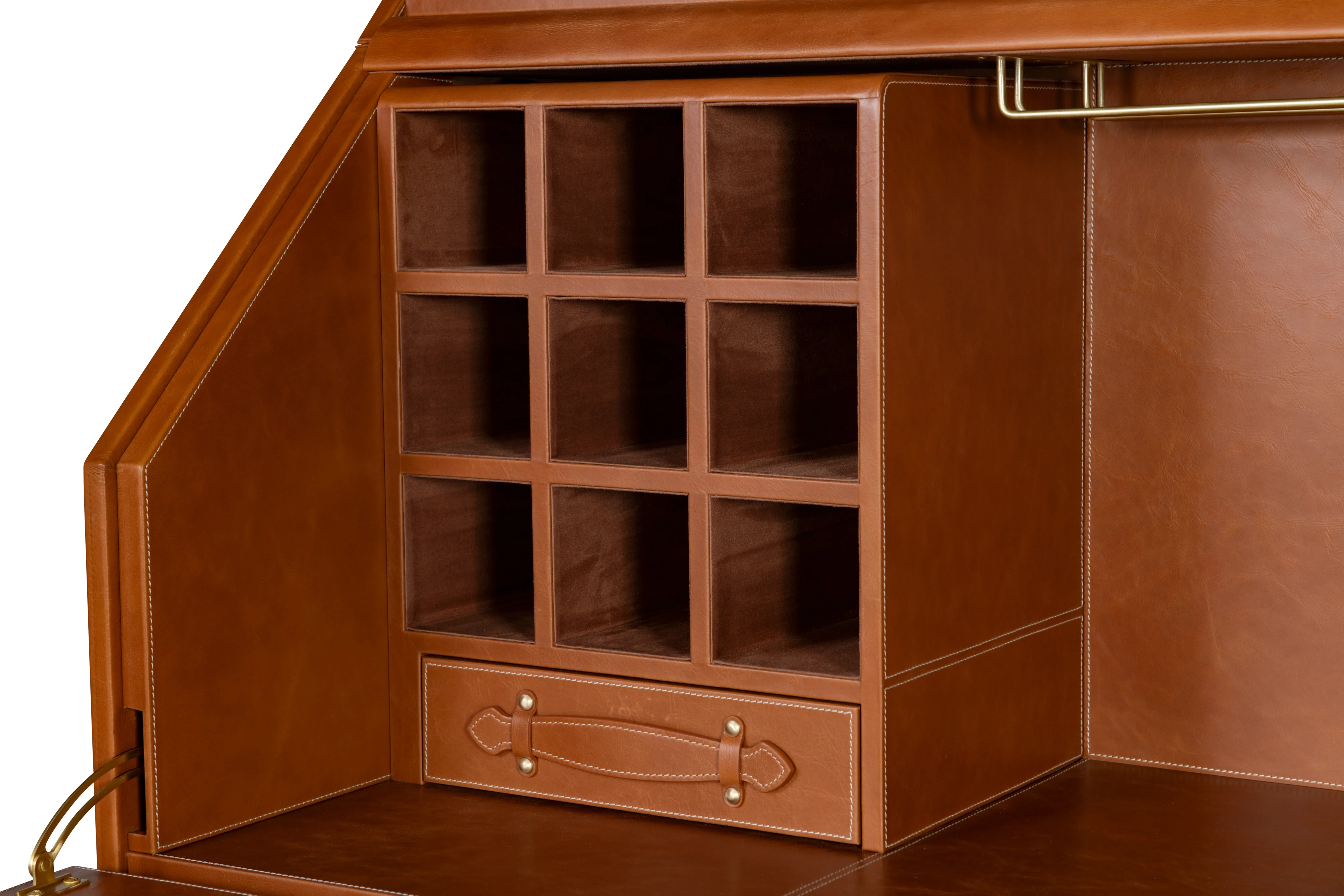 Leather-wrapped campaign style bar cabinet sitting on an oil finished oak base. Fitted bar interior with brass accents, storage, and glassware solutions. Contrast stitching throughout. The cabinet can fold closed or remain open to display its interior details.