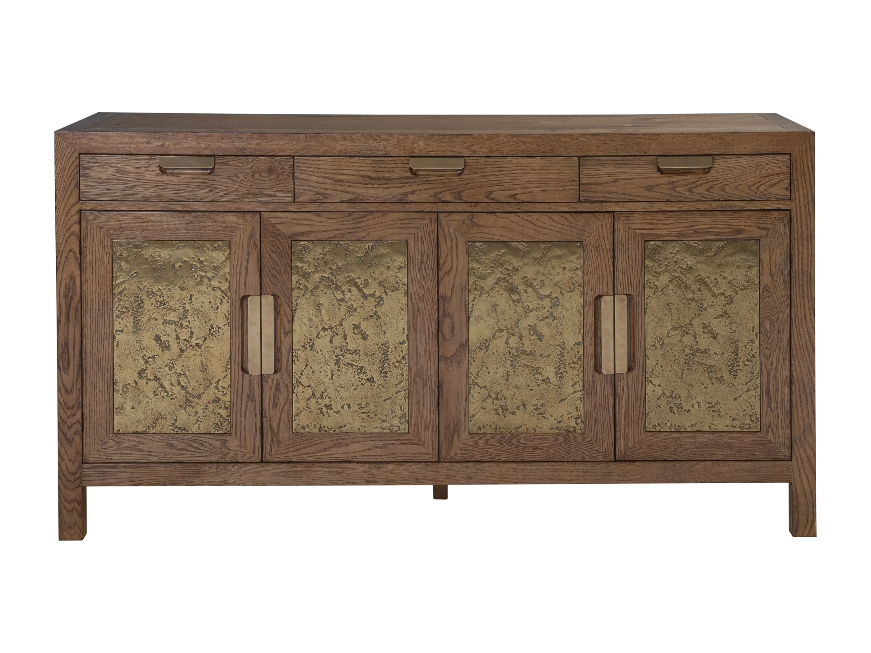 Three drawers with felt a silver pad inserts. Two sets of doors with two adjustable shelves inside. Door fronts have an inset cast panel in organic texture and champagne bronze finish.
