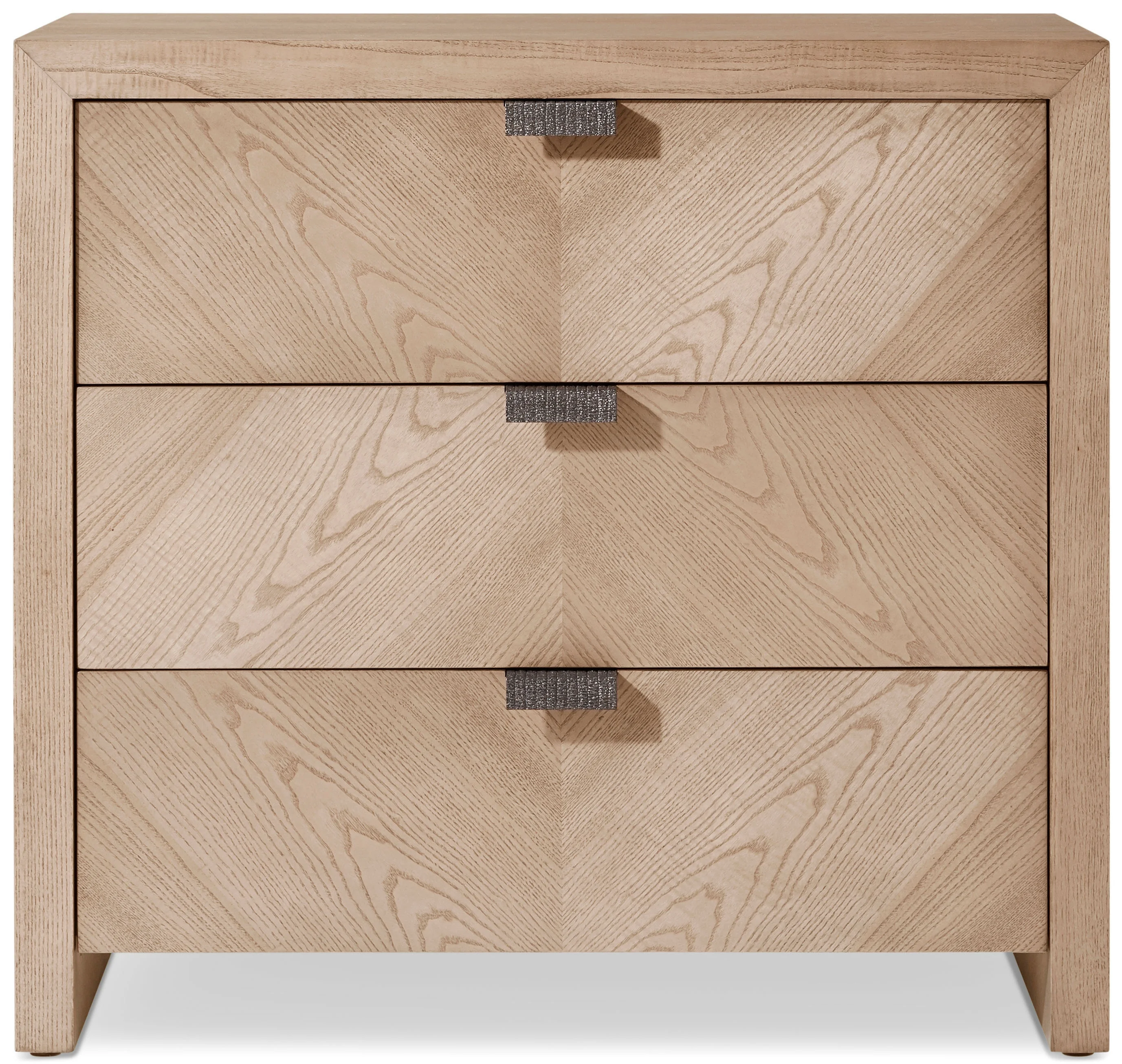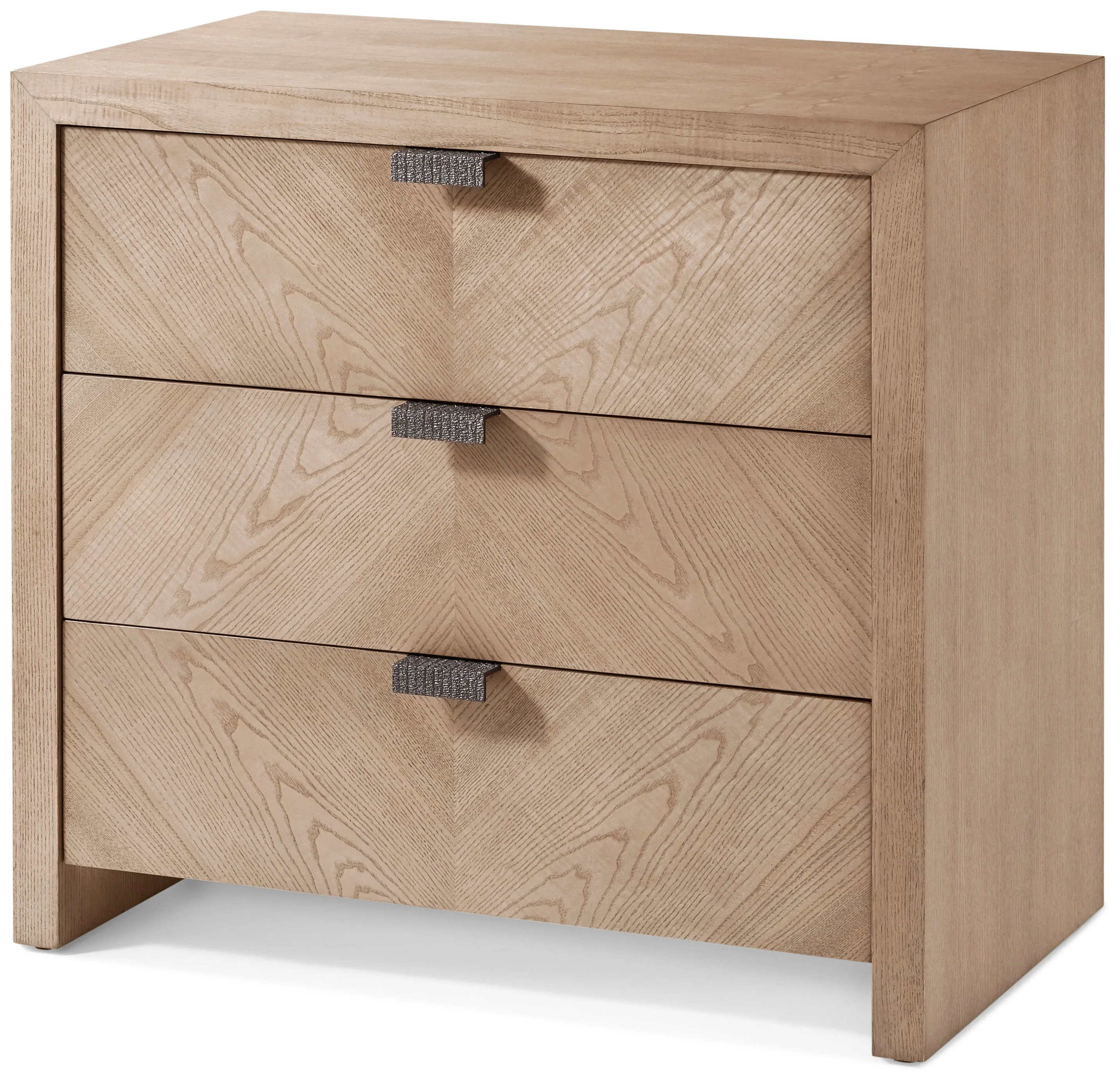 Aesthetically pleasing three drawer nightstand made of figured cathedral ash in artful grain patterns. Available in Dune or Earth with textured metal pulls in our Ember finish and soft close drawers.