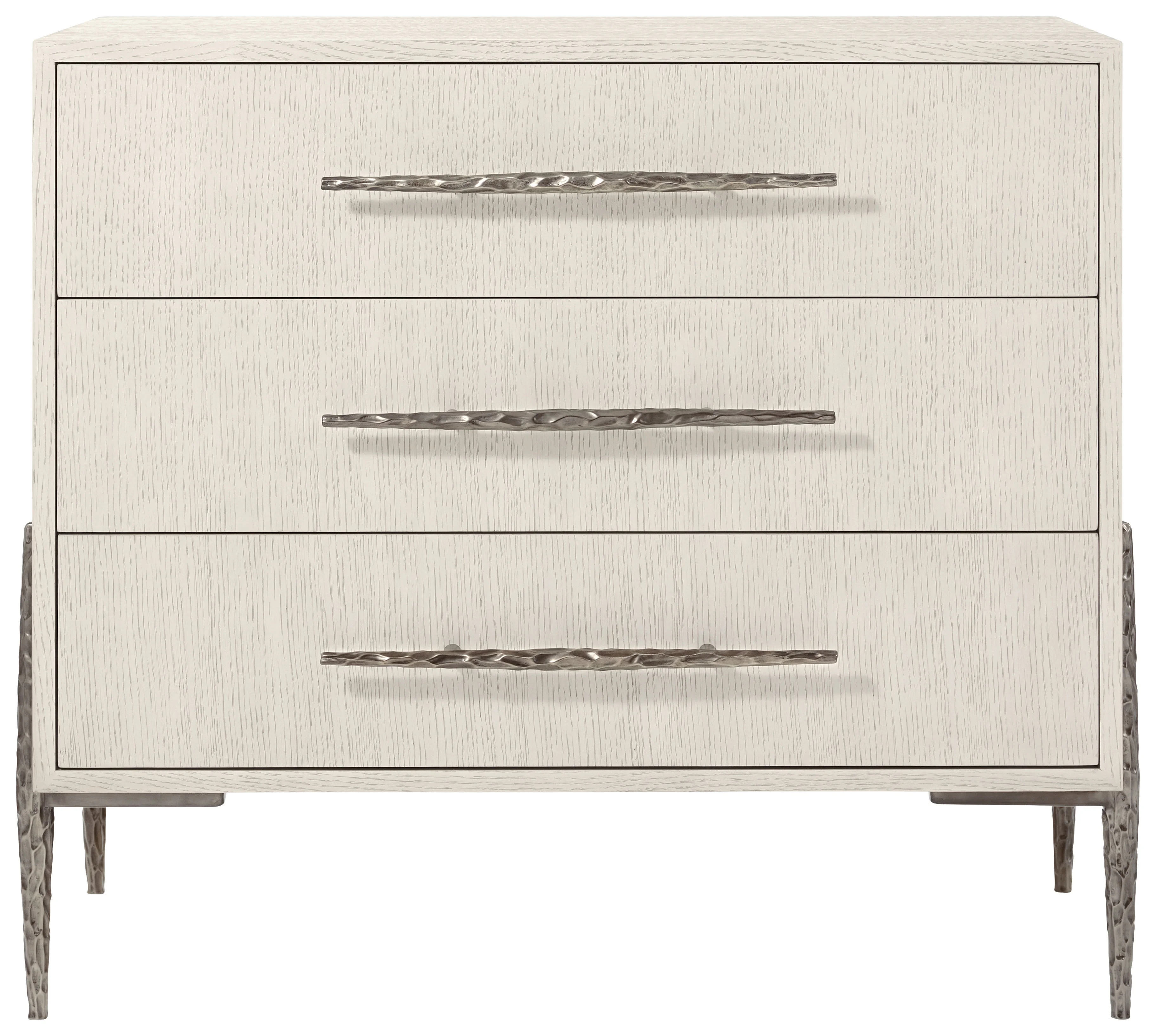 The Essence Three Drawer Nightstand gracefully contrasts hand textured metal pulls with an exquisite white oak frame. Perched delicately atop tapered legs.