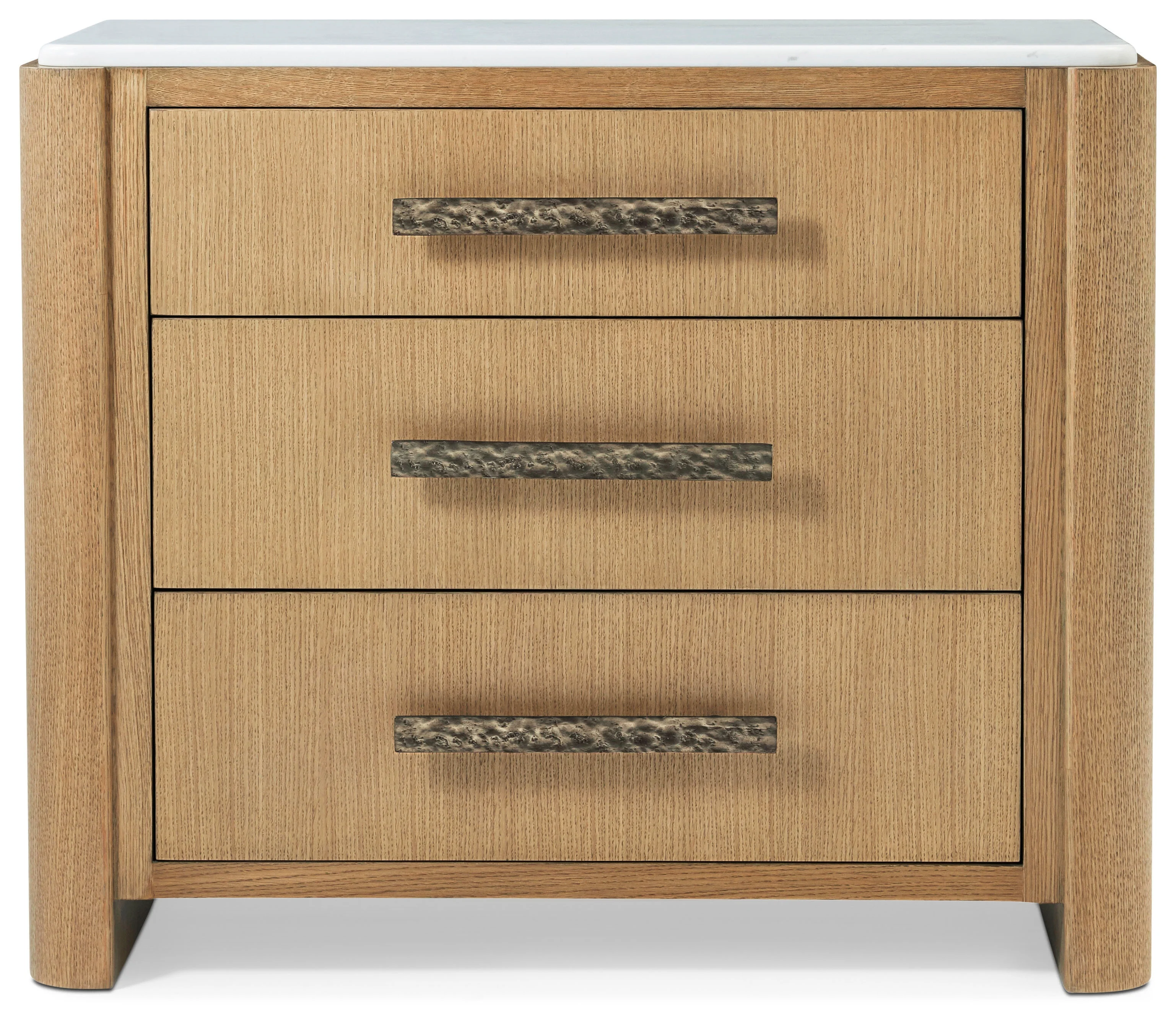 Honed marble delicately rests atop the exquisite white oak frame of the Essence Three Drawer Nightstand. An alluring focal point with graceful curves and hand cast metal hardware.
