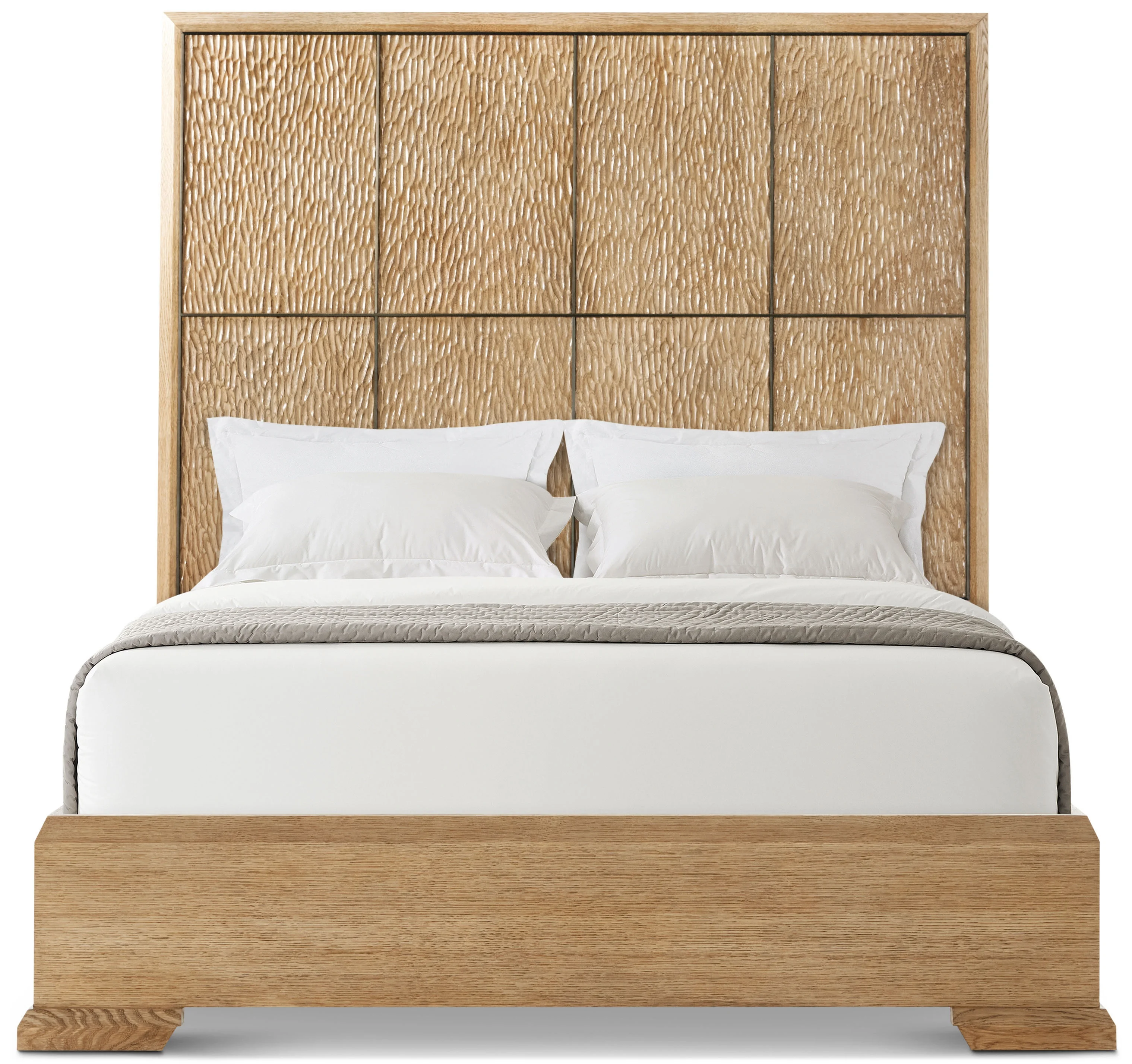 Slender, geometric lines create a tranquil pattern across the hand carved headboard of the Essence US King Bed. At its base is an alluring white oak frame.
