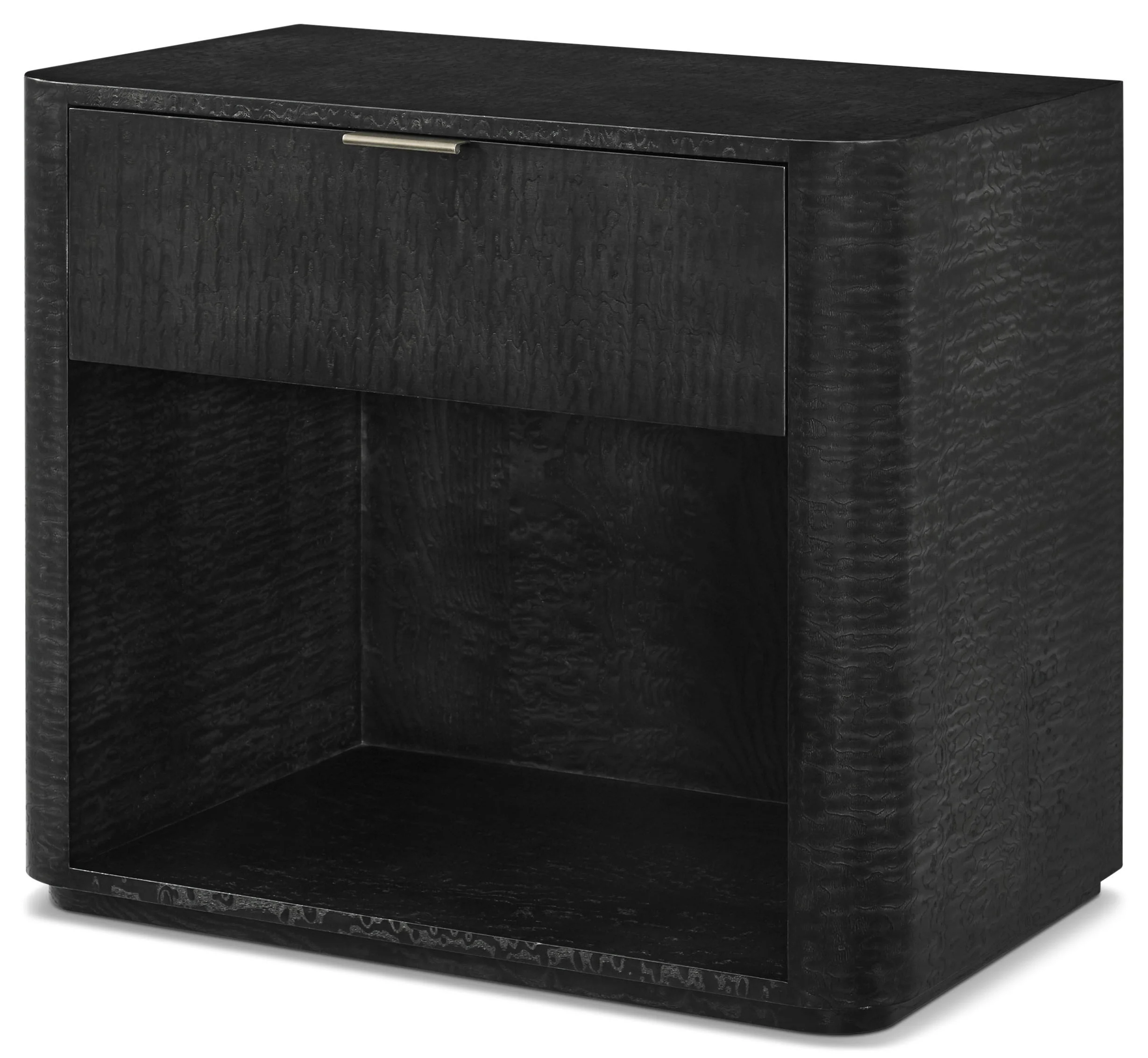 The Kesden Nightstand embodies elegant design with graceful curves and meticulous craftsmanship. Stunning, hand forged hardware creates a delicate contrast to the rich Tamo ash veneer in this exquisite bedroom masterpiece.