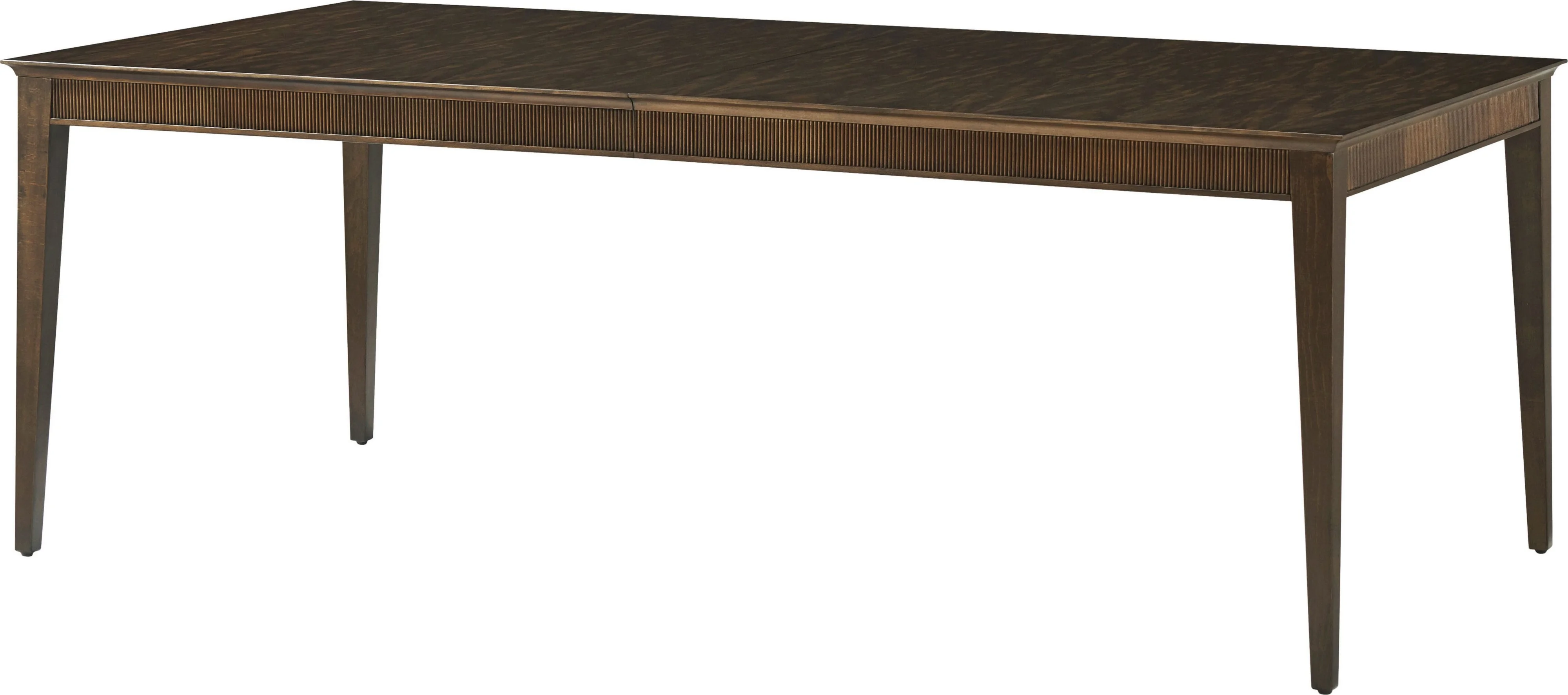 The Lido Rectangular Dining Table, crafted in a Prima Vera in our Bistre finish, features a reeded apron set upon sleek tapered legs. Includes two leaf inserts and two additional legs for a more luxurious dining experience.