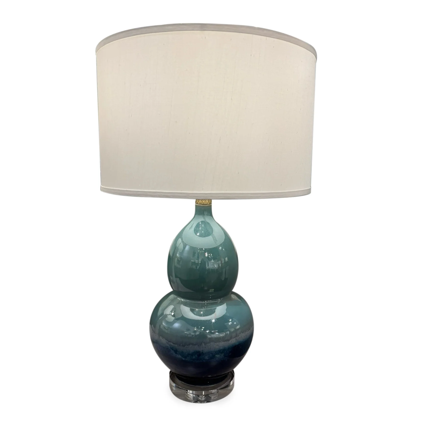 The Santa Barbara Table Lamp features a gracefully curved body crafted from glazed porcelain, displaying a beautiful blue-green ombré. The design rests atop a rounded clear crystal base and includes a sculptural metal accent in a brass finish with intricate texturing. A clear crystal ball finial with brass trim offers a refined finishing touch. This lamp is affixed with a three-way turnkey switch.