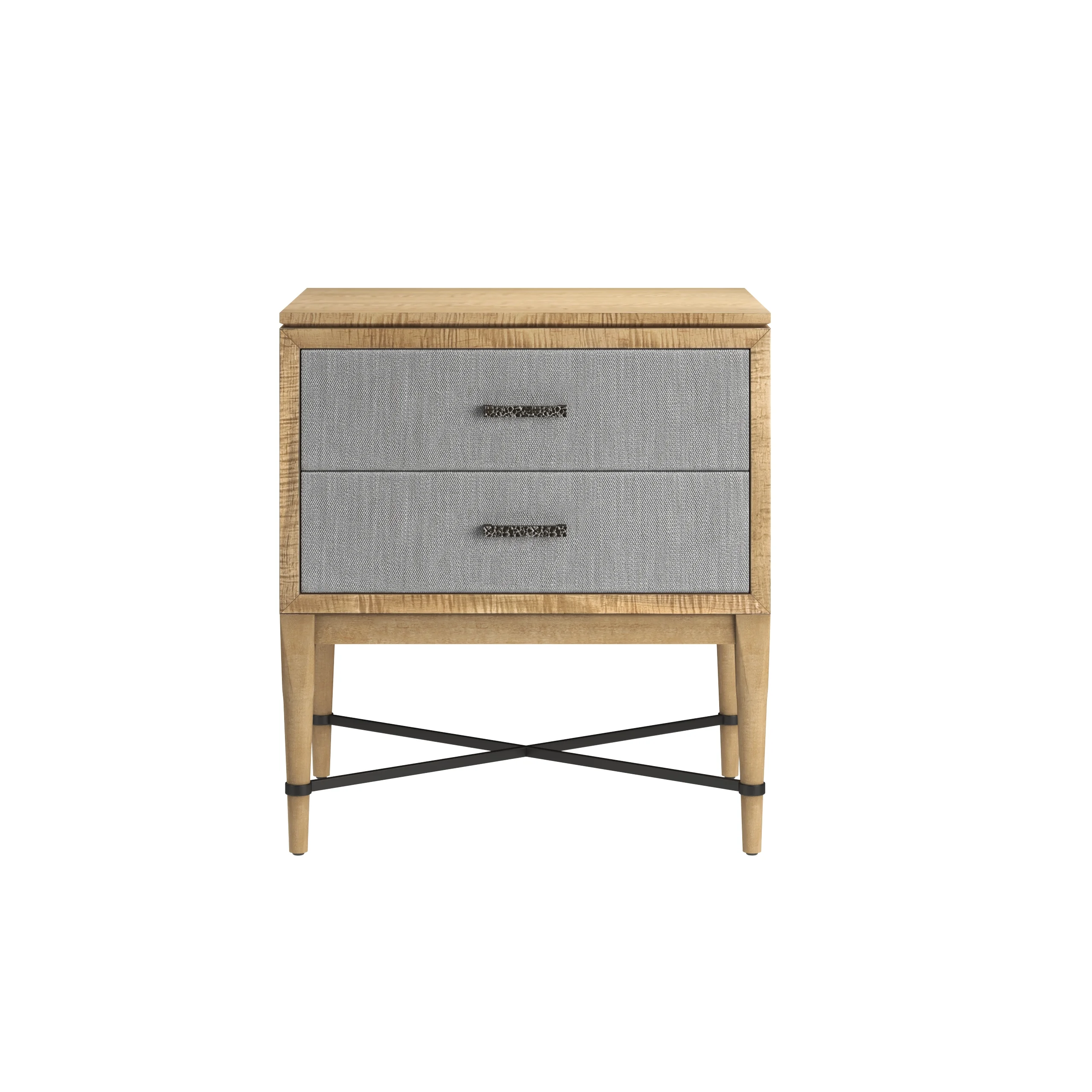 Classic contemporary 2 Drawer Nightstand with Textured Fabric Covered Drawers; Tapering legs and a metal X stretcher in Bronze Finish
