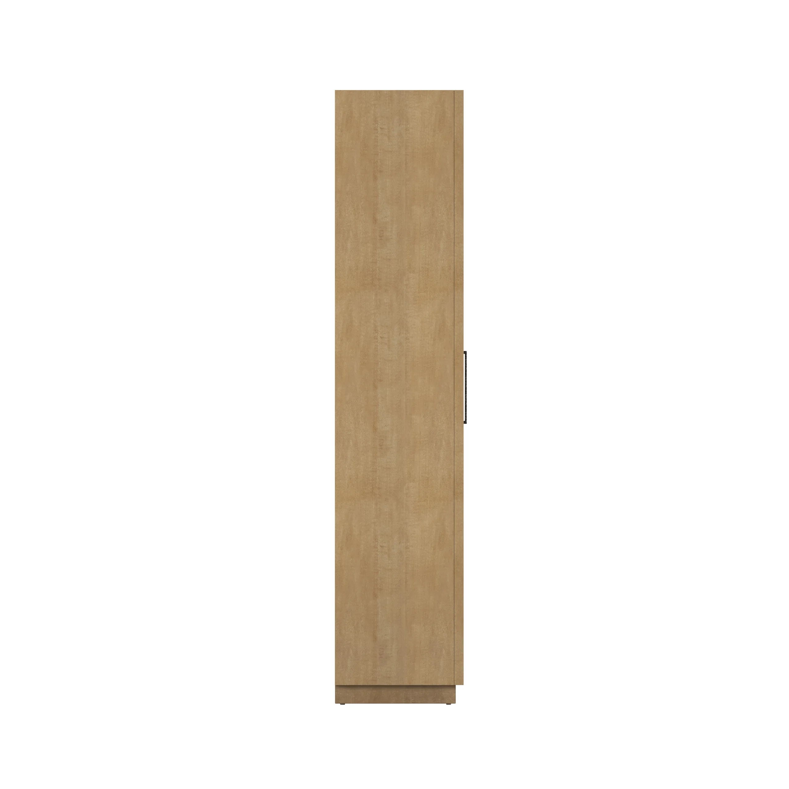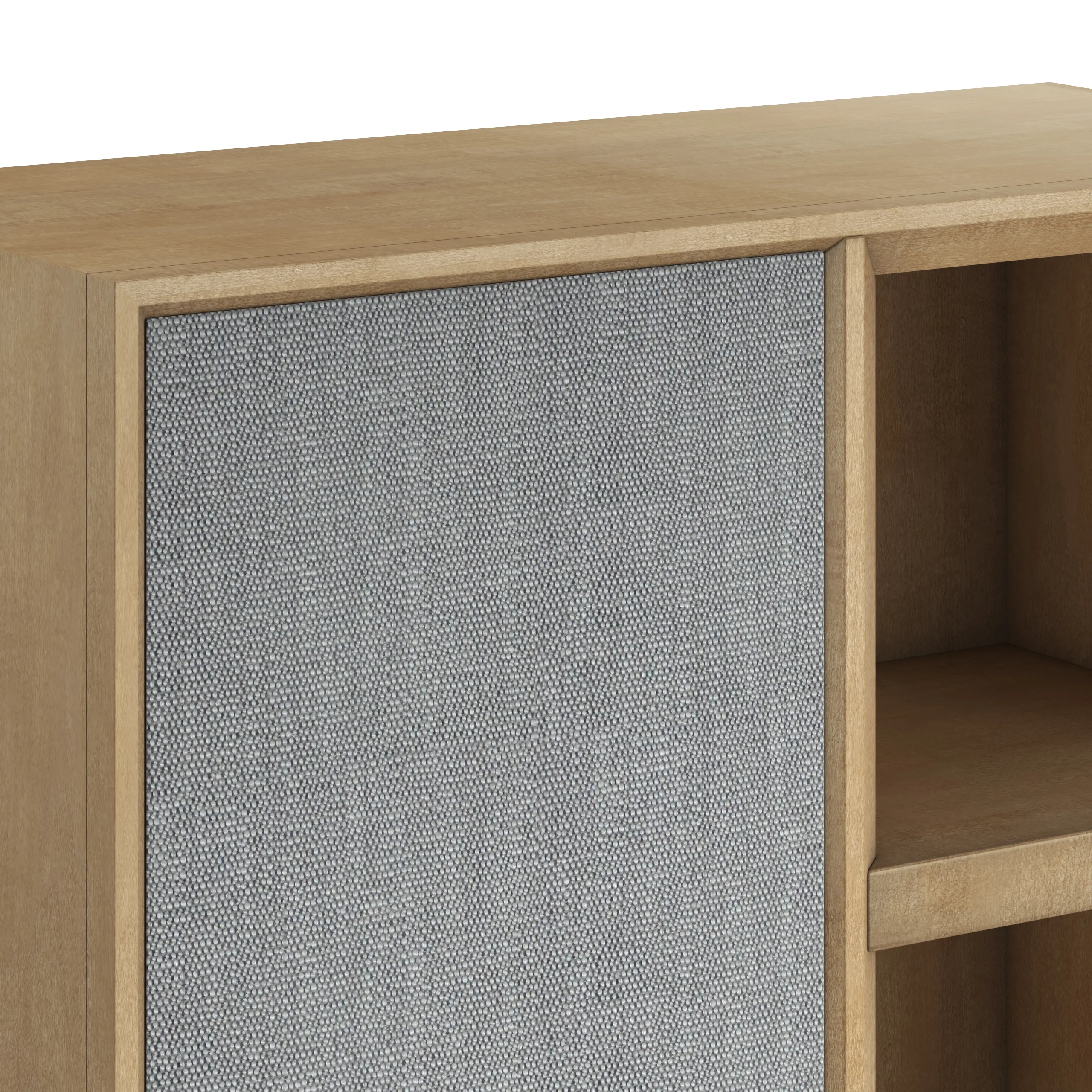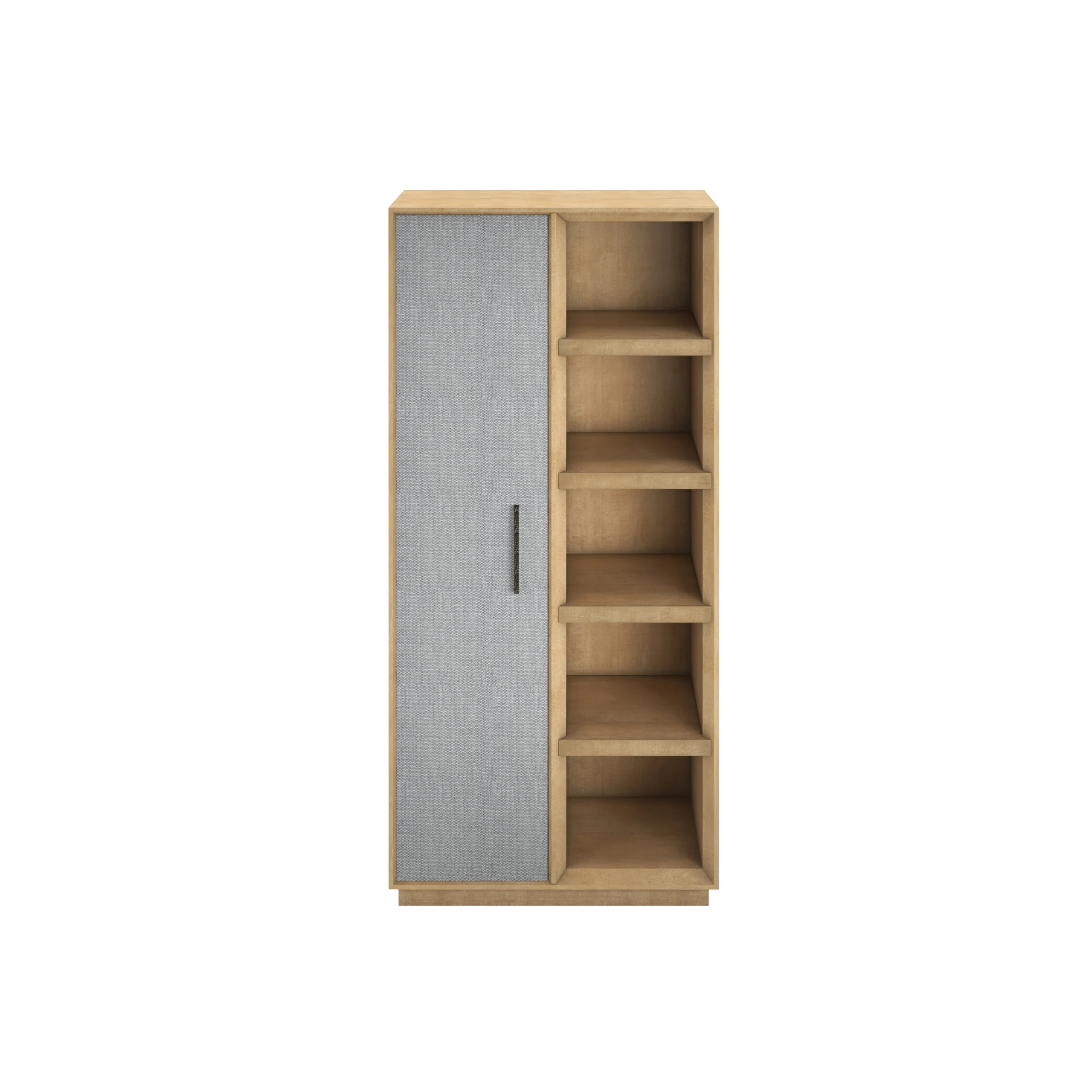 Classic Contemporary Etagere Bookcase in Figured Maple with Textured Fabric Door on the left and Shelves on the left.
