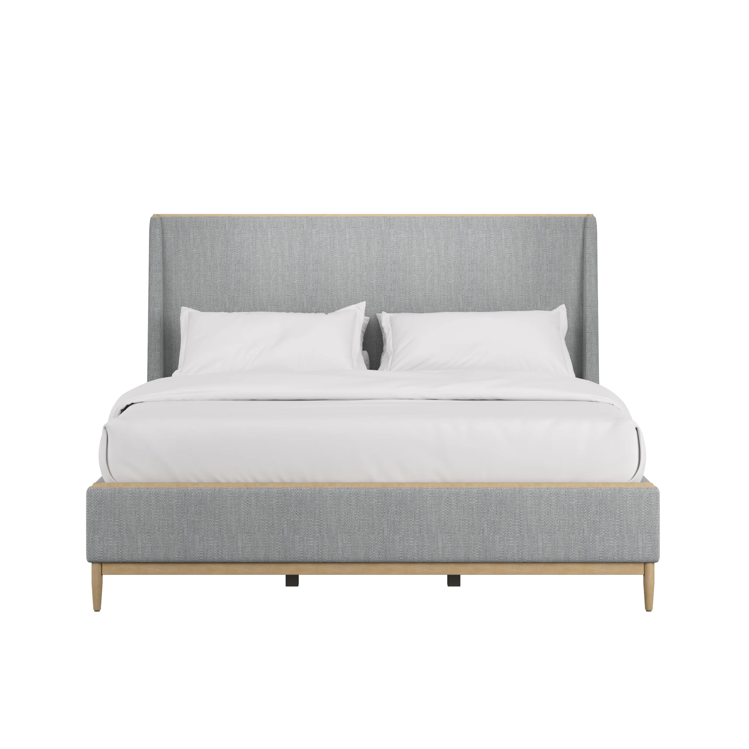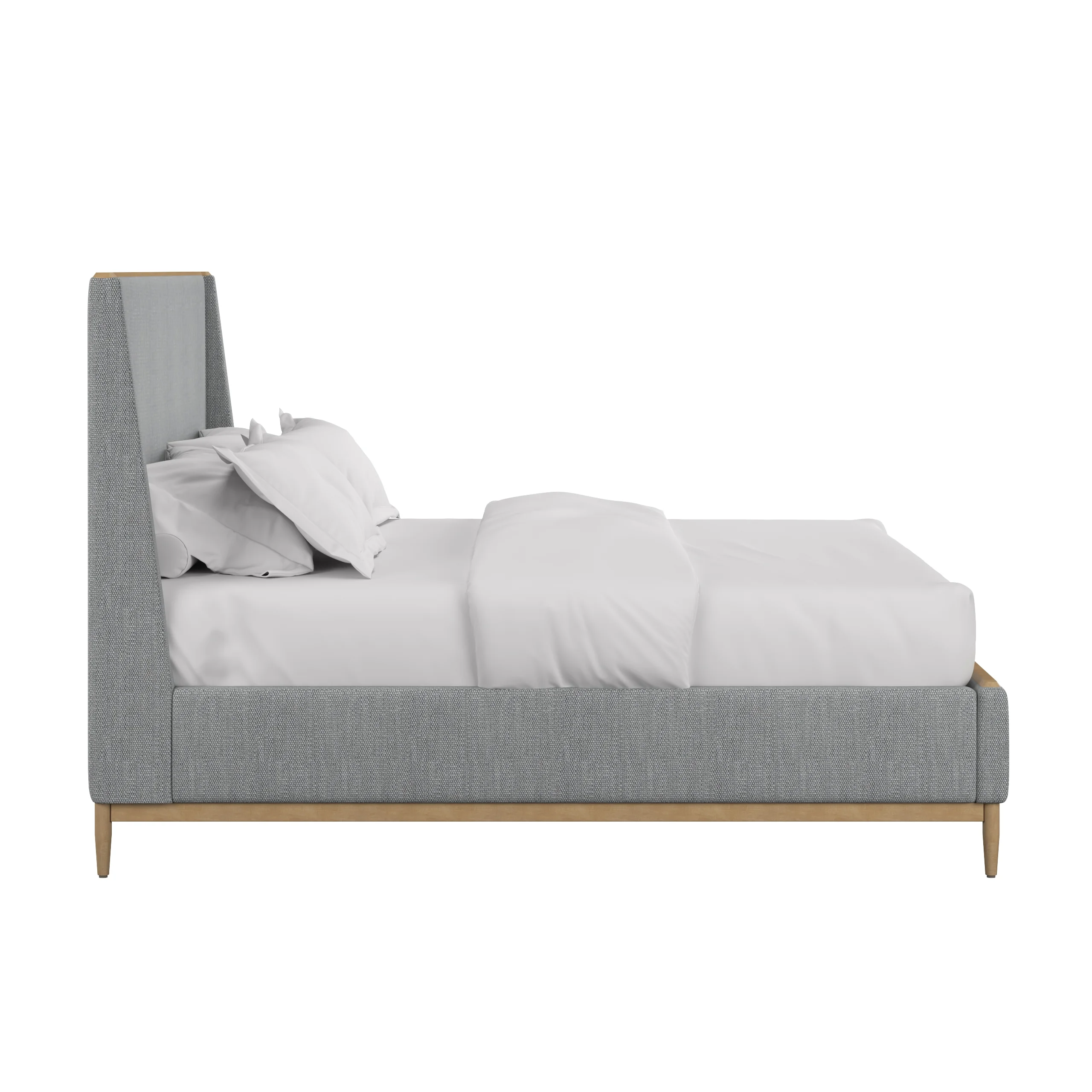 Classic Contemporary Maple Framed bed with subtile wing effect. Headboard, Footboard and Side Rails covered in Textured Gray Fabric