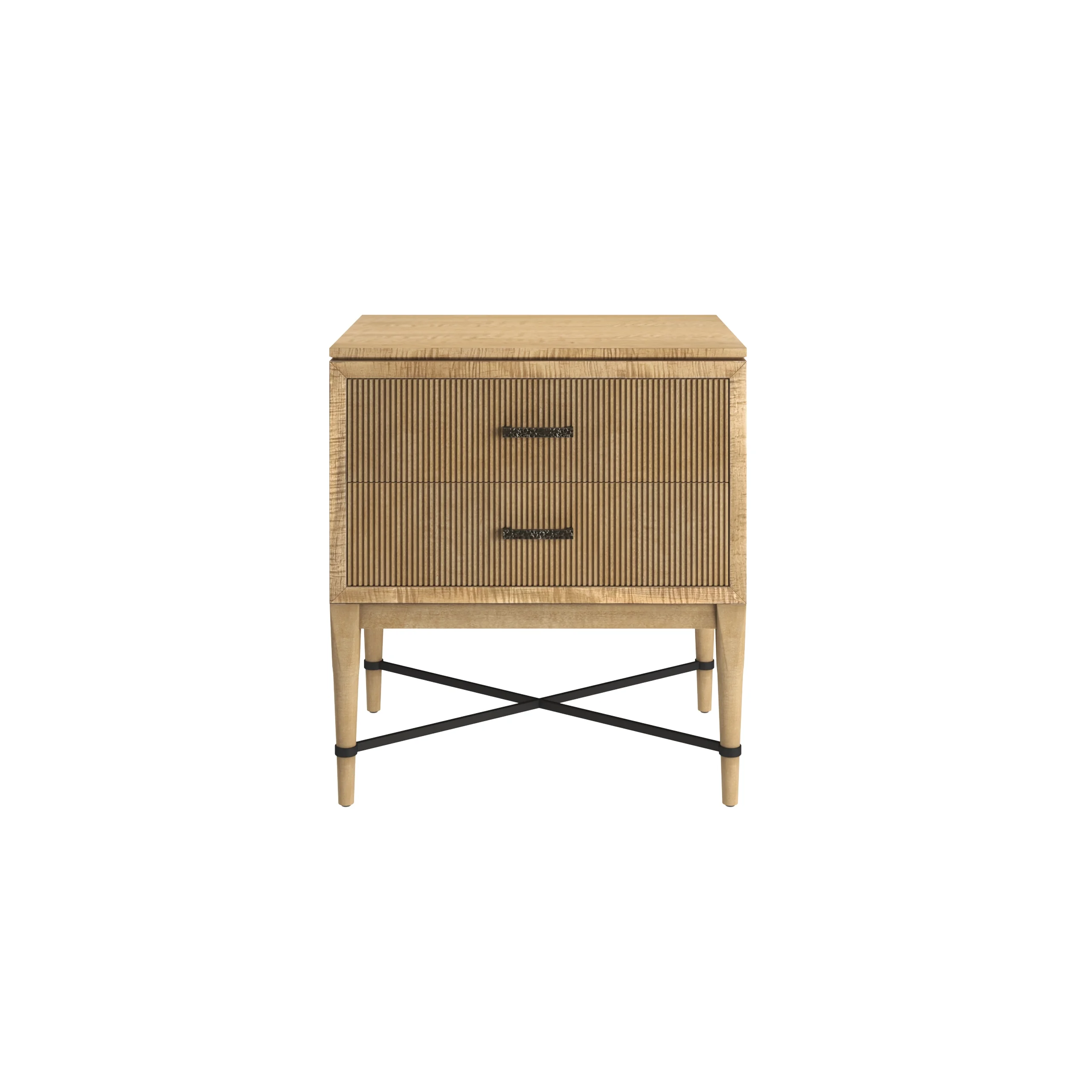 Classic contemporary 2 Drawer Nightstand in Figured Maple with Grooved Drawers, tapering legs and a metal X stretcher in Bronze Finish