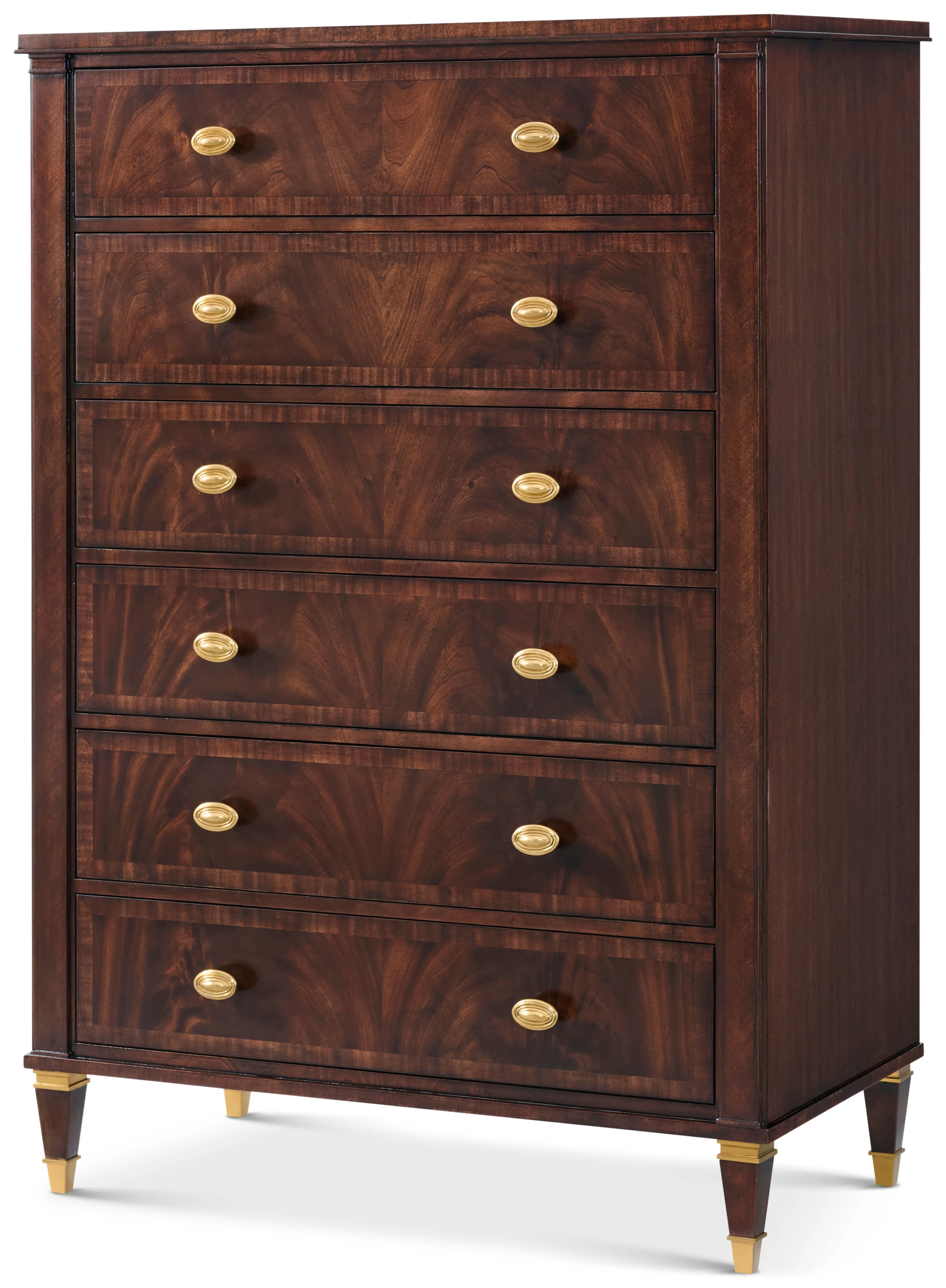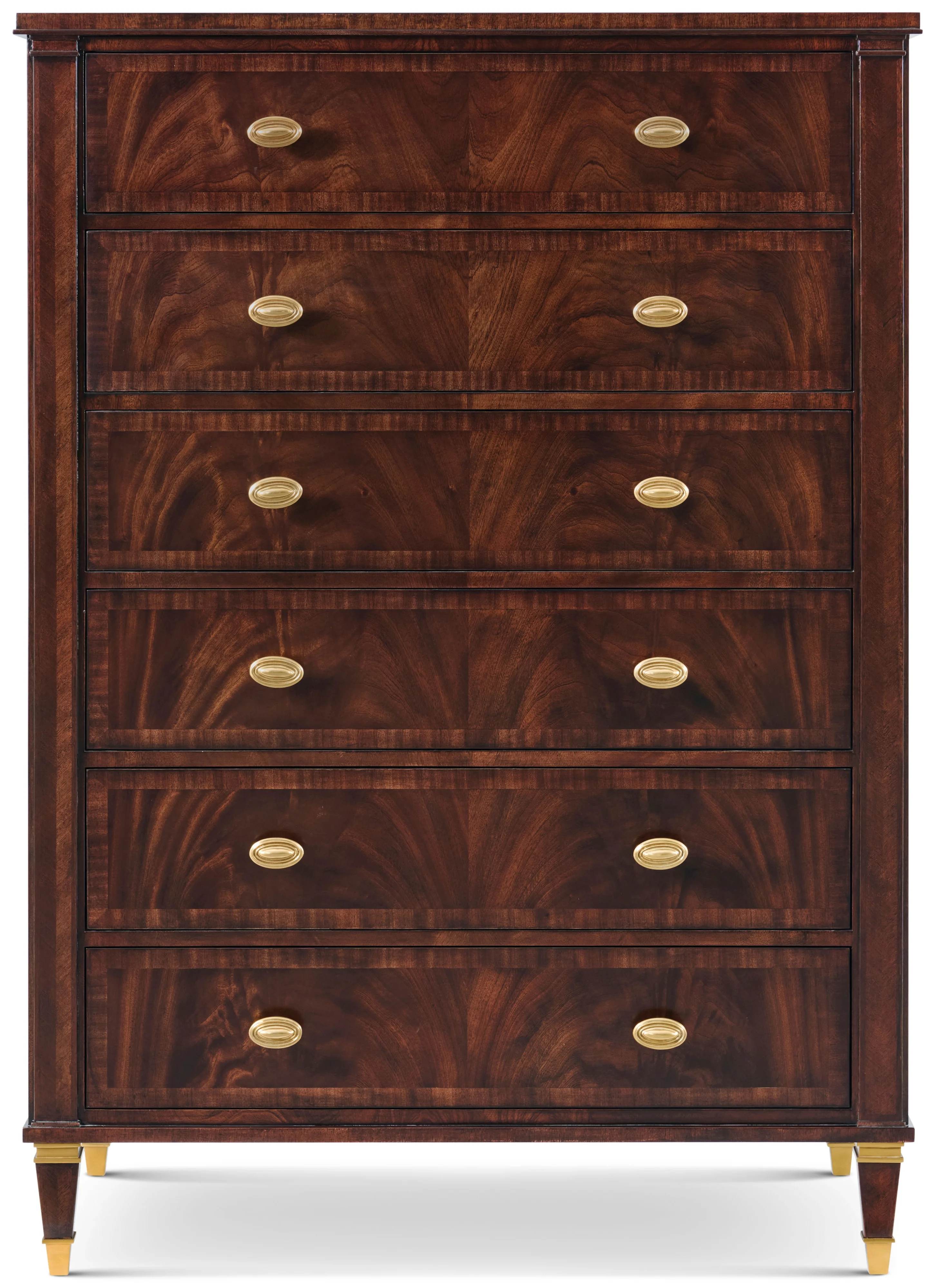 The Lee Chest pays homage to the elegant minimalist era of Art Deco design. This spacious chest offers six stacked drawers, each offset by lustrous elliptic Hampton Brass drawer pulls. An excellent companion piece for the Marlborough Collection's beds and nightstands, Lee features stout tapered legs with brass caps and matching decorative ferrules. The Lee Chest has been handcrafted from khaya swirl and is finished in a choice of two colorways, Cambridge or Geo Coast.