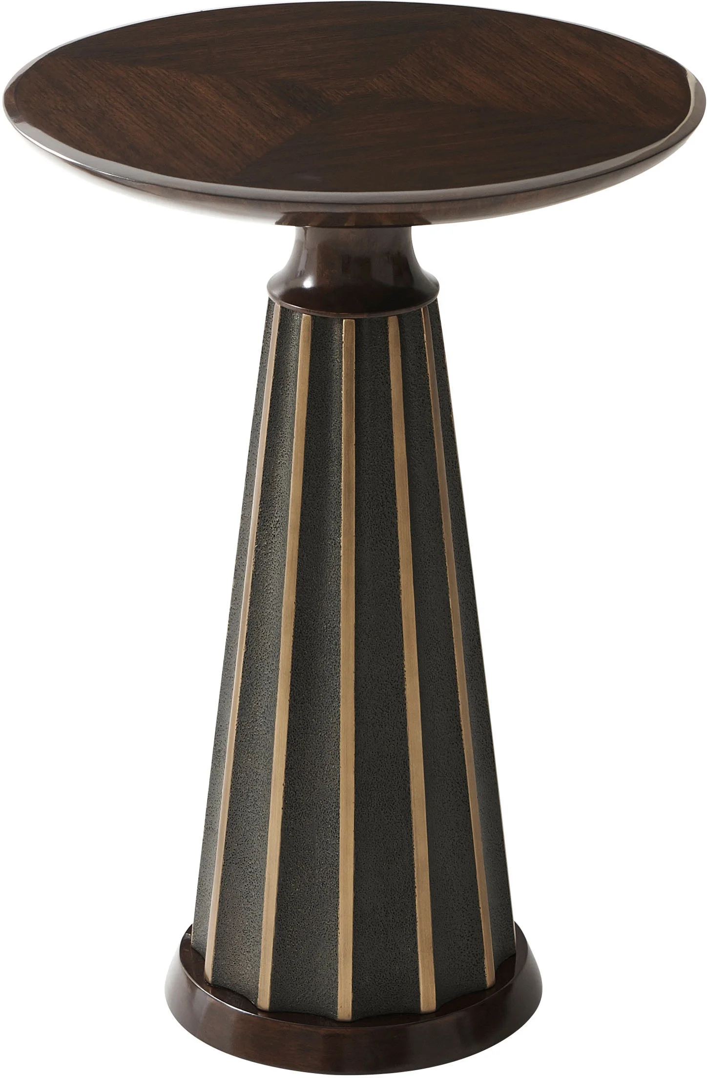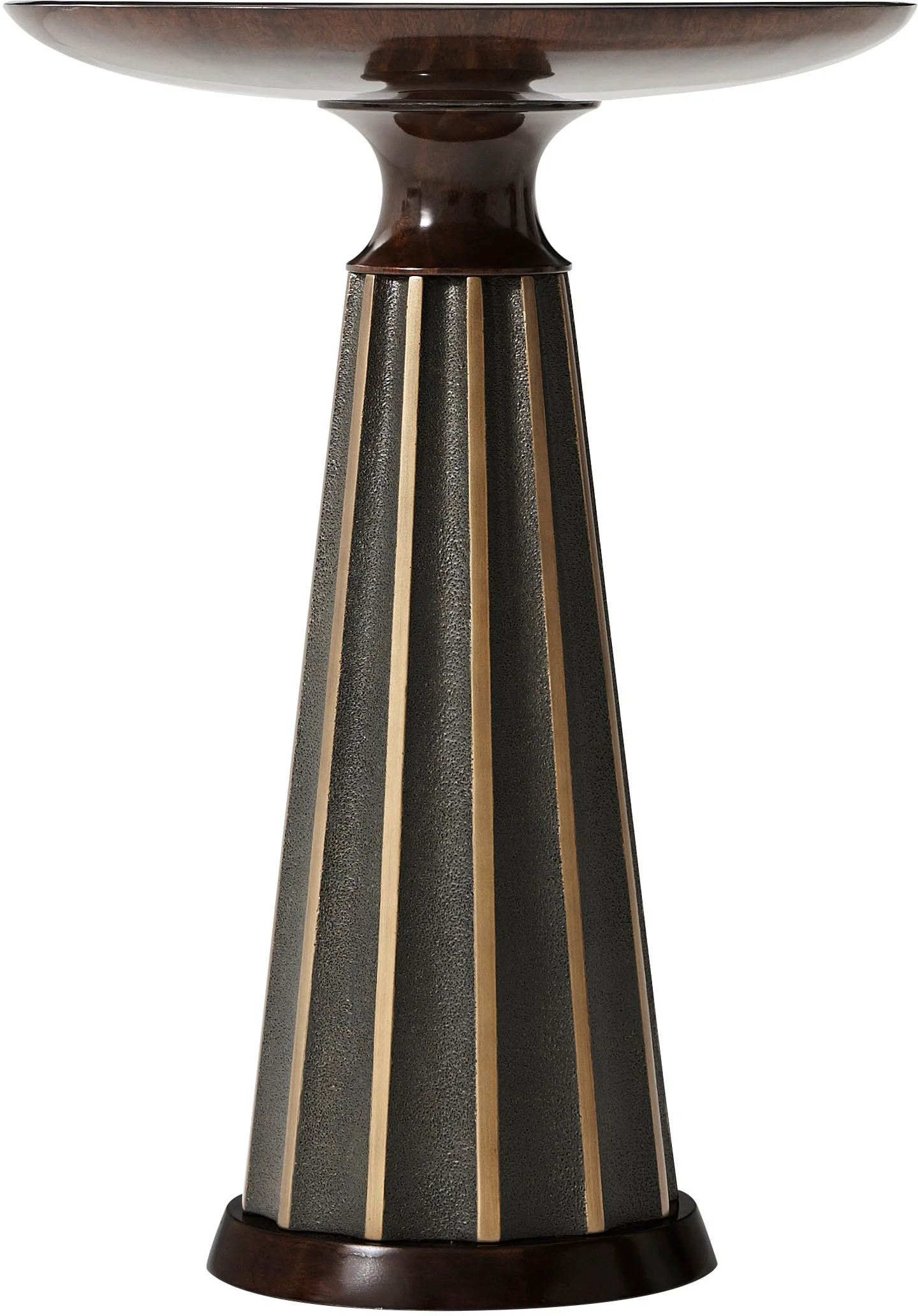 moreThis modern rustic drink table brings a touch of contemporary style to any room. Its round wood top is made from a combination of walnut veneer, composite, and mahogany, giving it a unique and eye-catching appearance. The tapered gear base adds an industrial chic touch, making it a great fit for those who appreciate a blend of rustic and modern elements.