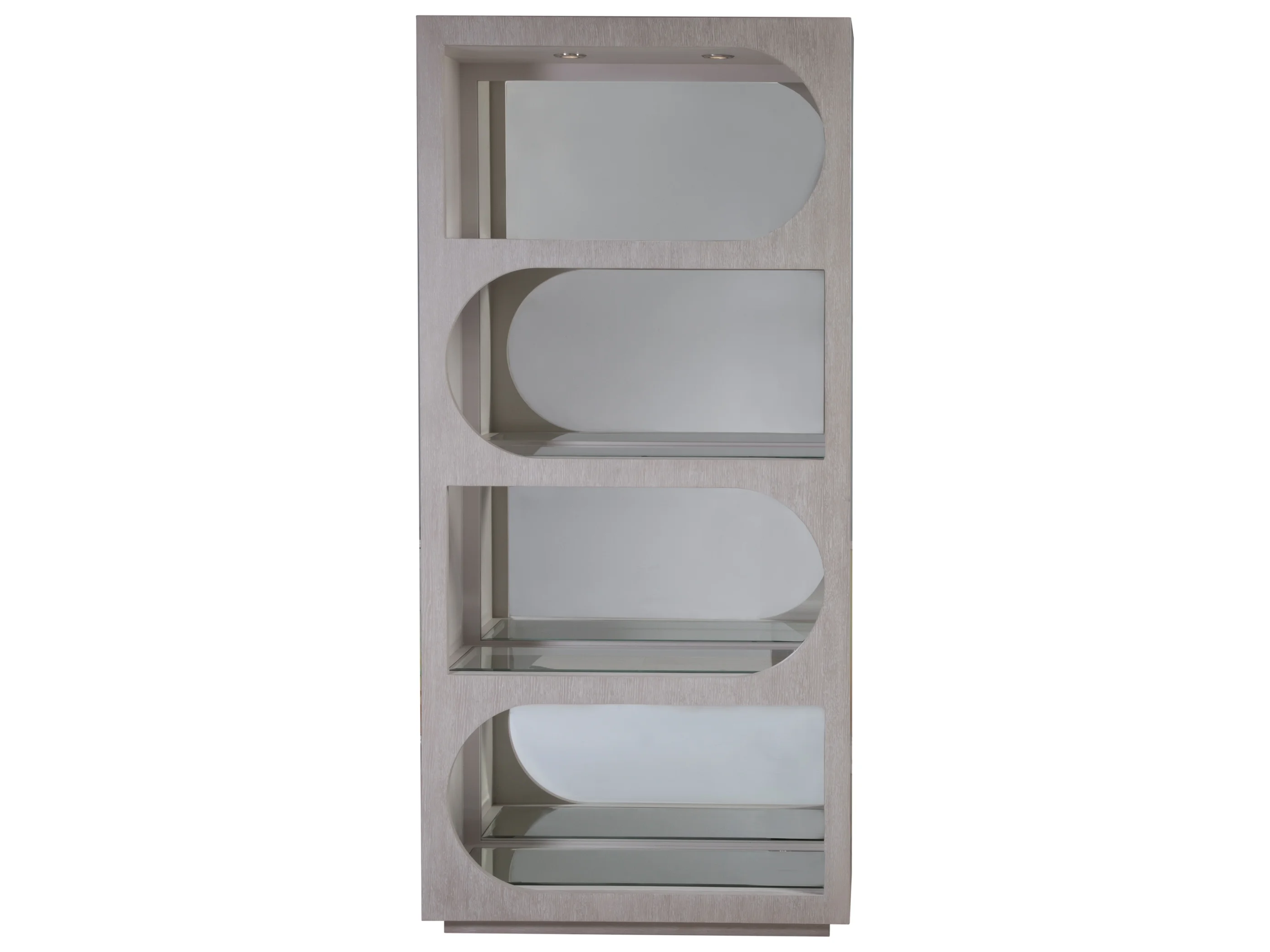 Stunning modern form boasting a seamless face panel with four alternating cutouts revealing a brilliantly lighted interior. The case is dressed in Solimar's signature cerused white oak, while the interior is contrasted in an even ivory paint that enhances the glow from the mirrored back and bottom panels. Four inset shelves (not adjustable) and touch LED dimmer (right side) are standard.