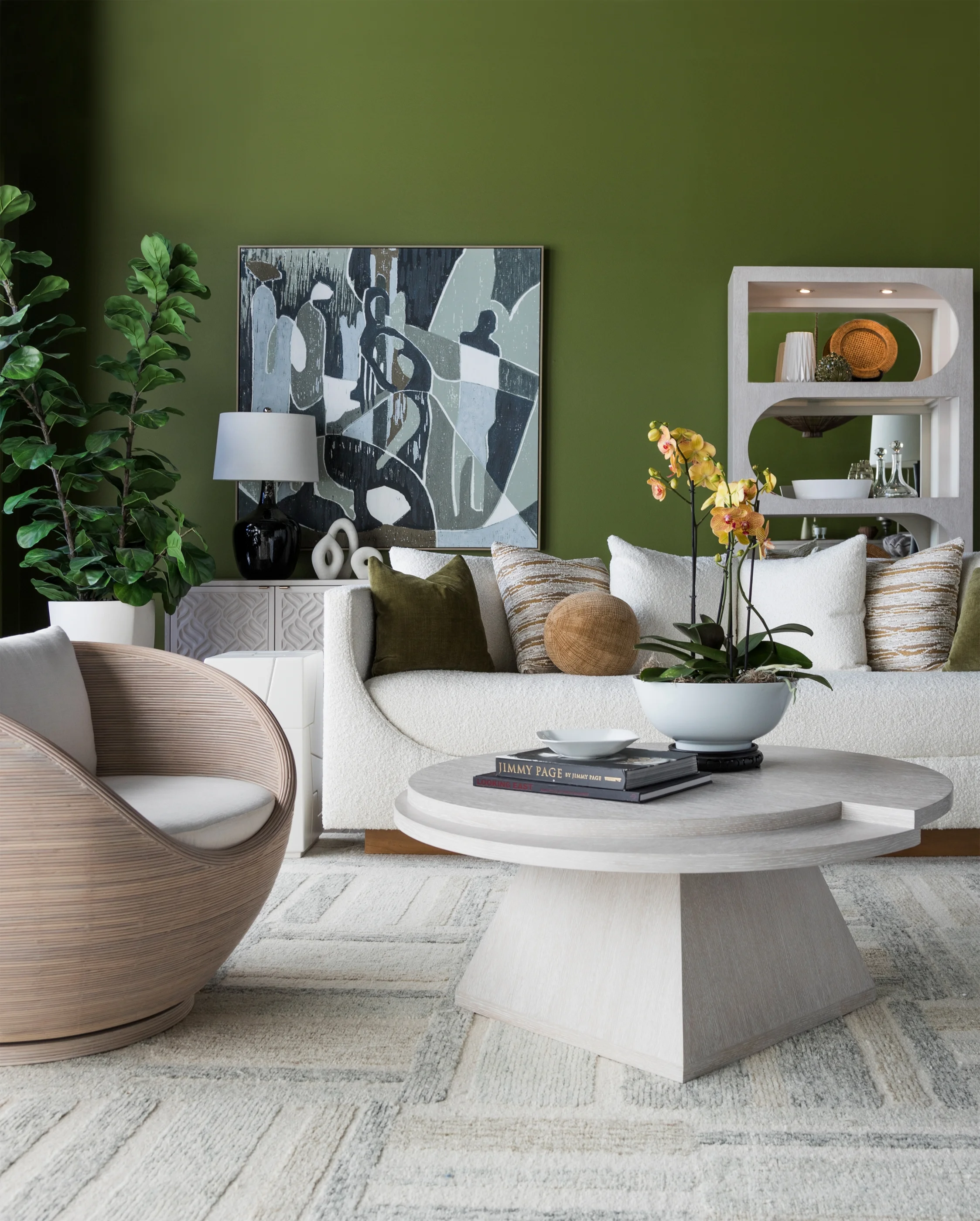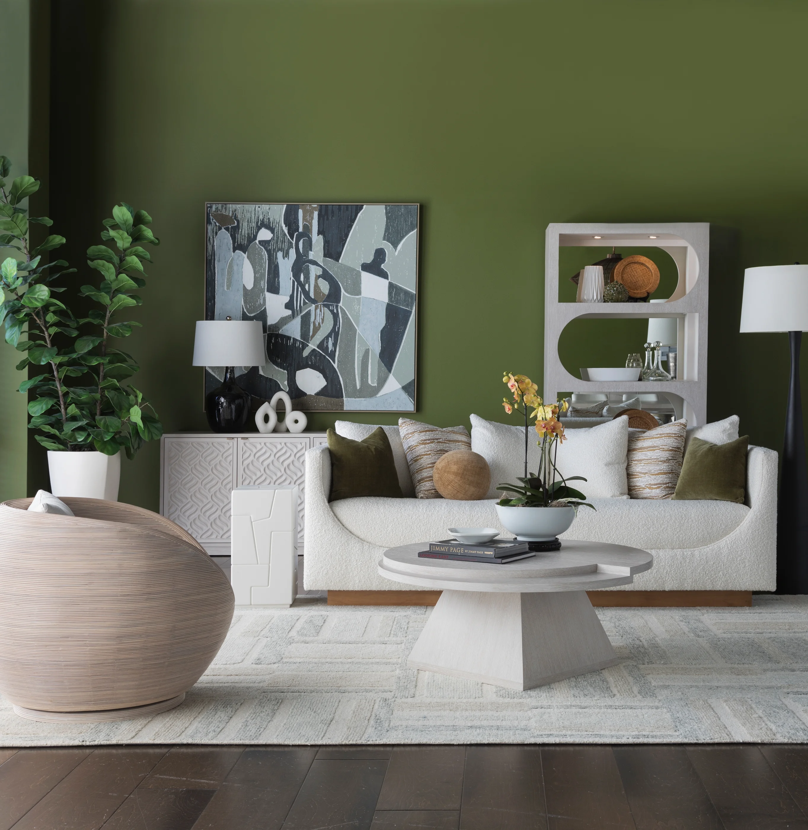 This 1960's antique reproduction is a period-perfect representation of Solimar's vibe, featuring an orb silhouette wrapped in pencil rattan with a white wash finish revealing natural variation in the organic material. Standard in SmartCare fabric 2292-11, a tightly woven chenille construction. Dimensions