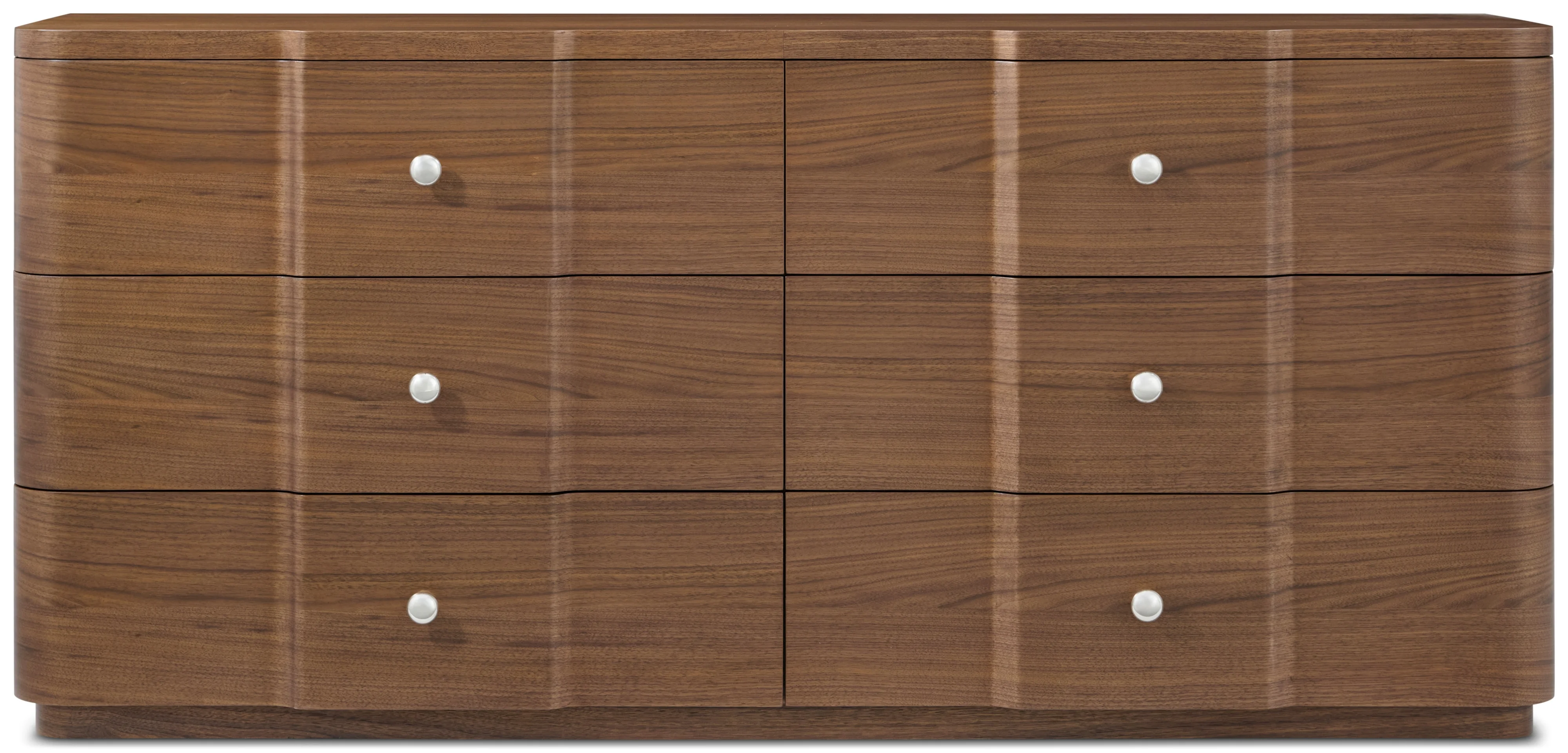 Crafted from warm Italian Walnut and styled for sophisticated modern living, the Walnut Dresser from the Spencer Coronet Collection features six spacious drawers accented with nickel-plated drawer pulls and hardware. Rounded corners on either side of the piece and subtle changes in elevation across the drawer surfaces offer added visual interest.