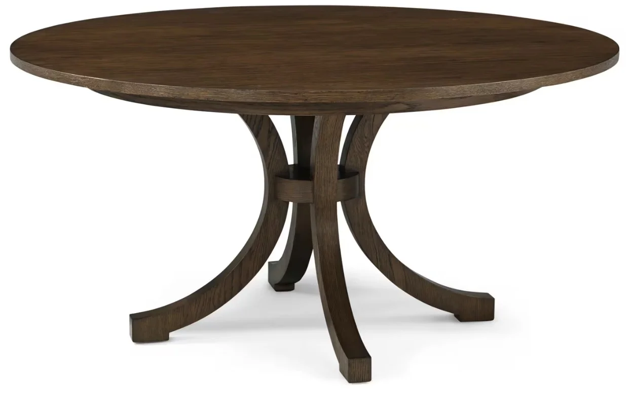 Influenced by the historical forms of antiquity, the early 1800s can be characterized by its refined take on classical forms. In the Surrey round dining table, curved forms take a distinct X shape in this elegant nod to 19th century design. Above, a remarkable oak wood surface. Beautifully composed from a rich oak wood. Finished in Brownstone.
